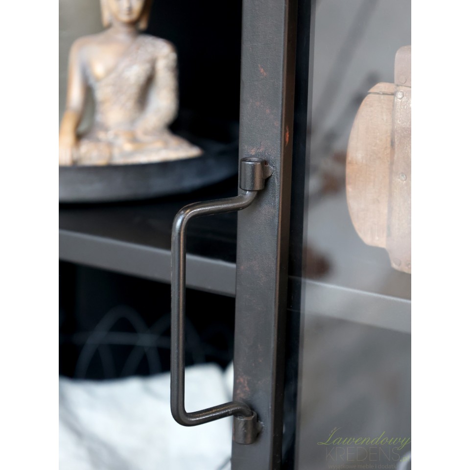 Dolna część witryny, wykonana z solidnego metalu, to nie tylko element funkcjonalny, ale także praktyczne rozwiązanie. Zabudowana część skrywa w sobie przestrzeń, która pomieści rzeczy, które chcesz zachować poza zasięgiem wzroku, dodając wnętrzu uporządkowany charakter.