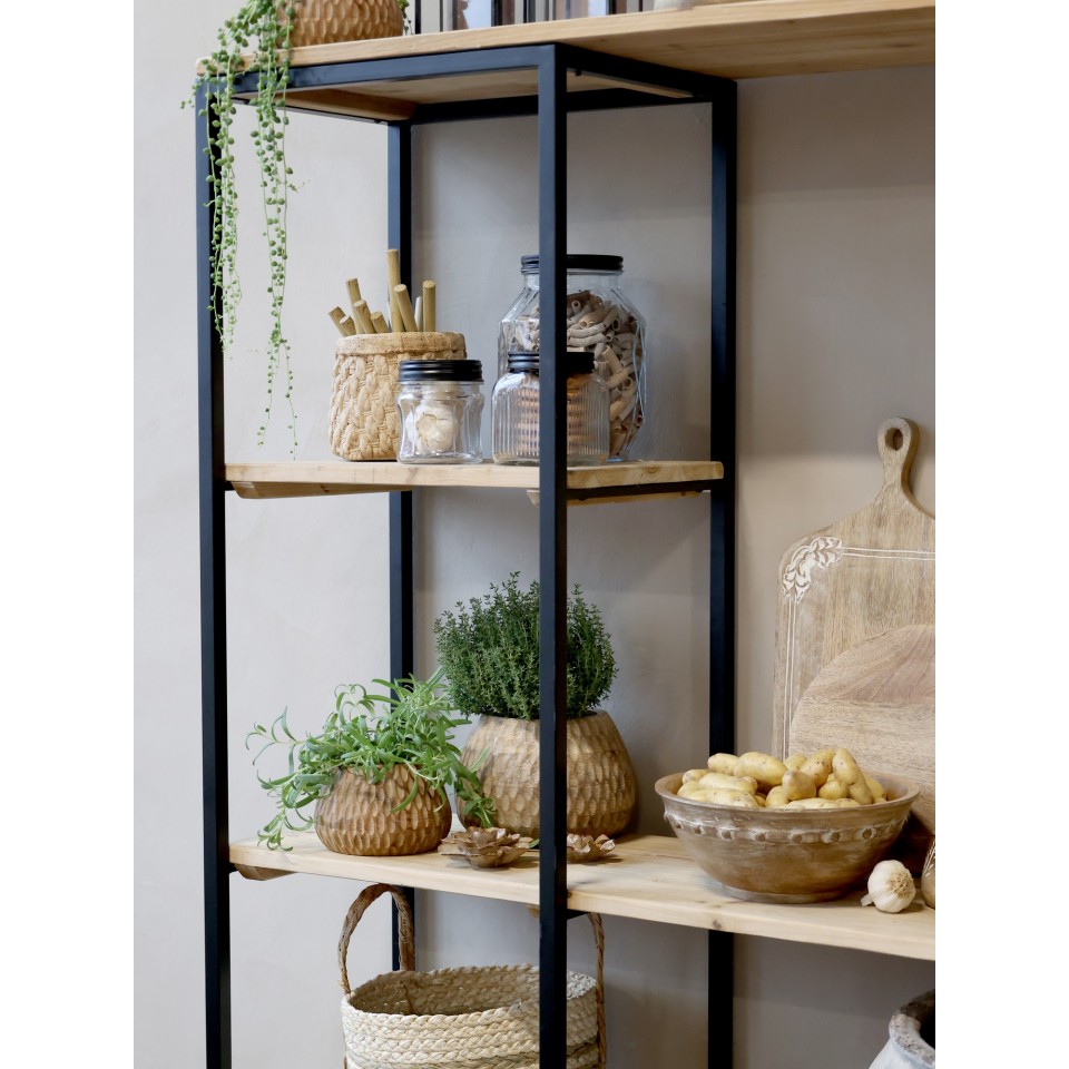Oto regał loft Vence Chic Antique. Jego czarna, metalowa ramowa konstrukcja stanowi solidną podstawę dla dwóch rzędów półek rozmieszczonych po bokach, które oferują mnóstwo miejsca do przechowywania książek, ozdób czy innych drobiazgów.