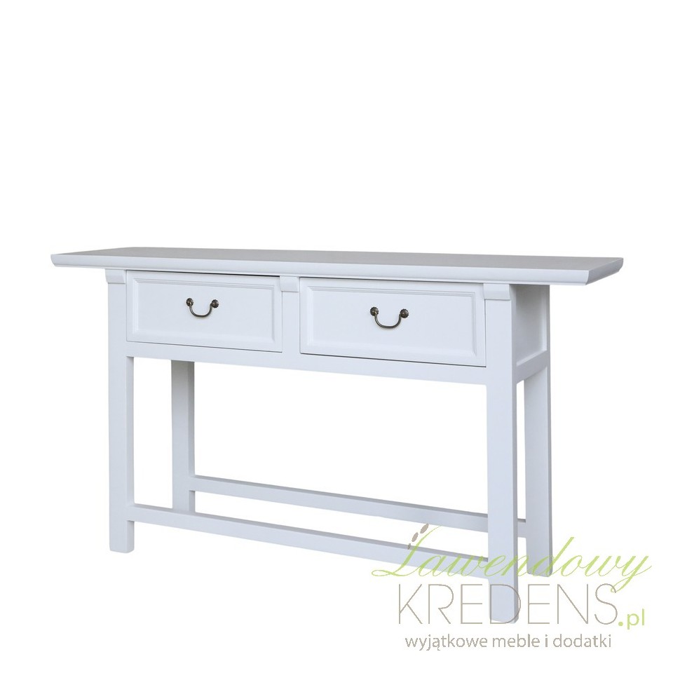 Dwie pojemne szuflady z metalowymi uchwytami dodają jej funkcjonalności, pozwalając przechowywać niezbędne drobiazgi, dokumenty czy akcesoria, które chcesz mieć zawsze pod ręką. Szerokość 150 cm i wysokość 85 cm sprawiają, że konsola jest wszechstronna i może pełnić różnorodne funkcje w zależności od potrzeb. Jej biały kolor nadaje wnętrzu lekkości i optycznie powiększa przestrzeń, co czyni ją doskonałym wyborem zarówno do większych, jak i bardziej kompaktowych pomieszczeń.
