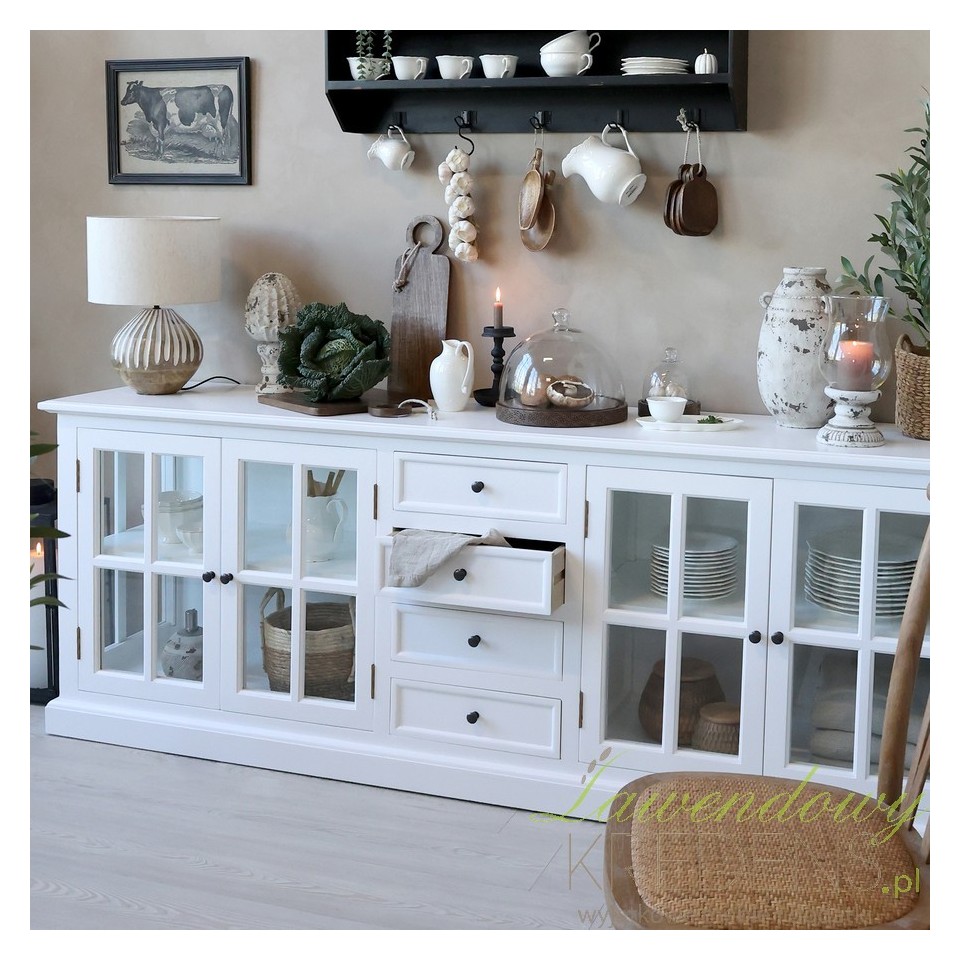 Dzięki szerokości wynoszącej 220 cm biała komoda szeroka Chic Antique oferuje dużo miejsca do przechowywania, co czyni ją idealnym rozwiązaniem zarówno do salonu, jadalni, jak i sypialni. Wykonana z drewna topoli, charakteryzuje się trwałością i naturalnym pięknem, które podkreśla biały kolor wykończenia. Wysokość 80 cm sprawia, że komoda jest funkcjonalna, a jednocześnie idealnie nadaje się do wyeksponowania dekoracji, takich jak wazony, świece czy rodzinne fotografie.