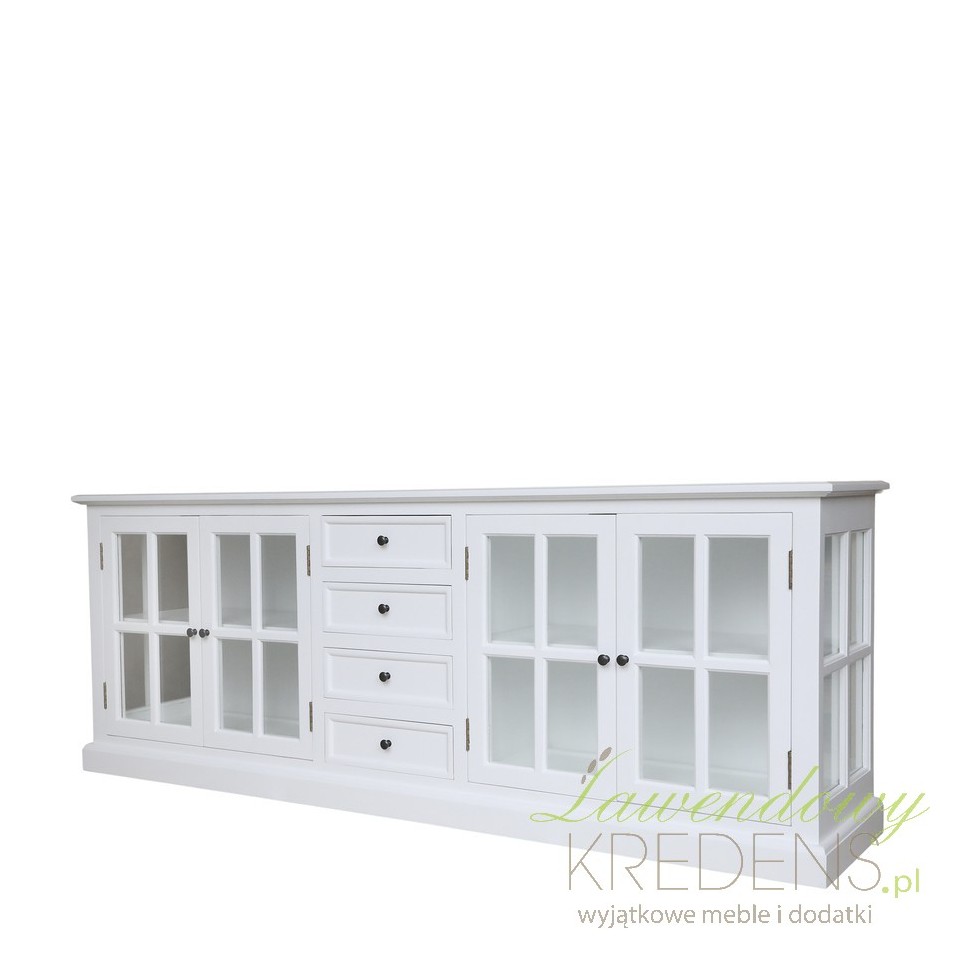Projekt komody obejmuje środkowy rząd czterech pojemnych szuflad oraz boczne szafki z przeszklonymi frontami i bokami, które zostały podzielone szprosami na mniejsze okienka. Taki układ nadaje meblowi lekkości i uroku, a jednocześnie eksponuje przechowywane w szafkach przedmioty.