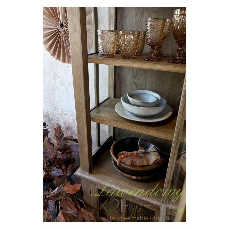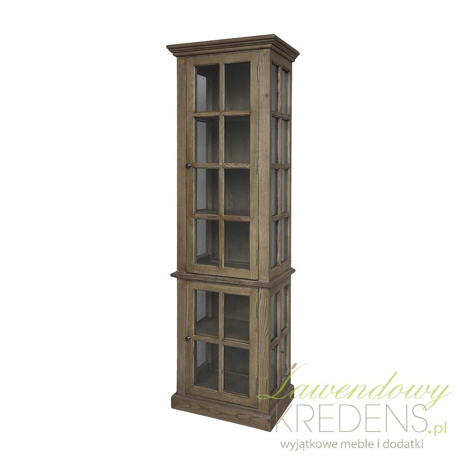 Witryna posiada dwa moduły. Górna część, wyposażona w trzy półki, jest idealna do wyeksponowania porcelany, ozdobnych szkliw czy ulubionych dekoracji. Dzięki przeszklonym bokom i drzwiom przedmioty prezentowane wewnątrz zyskują dodatkowy blask. Dolna część z jedną półką, także zamykaną szklanymi drzwiami, oferuje dodatkowe miejsce do przechowywania rzeczy, które wymagają schowania. Dzięki kompaktowym wymiarom – 60 cm szerokości, 40 cm głębokości i 195 cm wysokości – witryna świetnie sprawdzi się zarówno w niewielkich, jak i bardziej przestronnych pomieszczeniach.