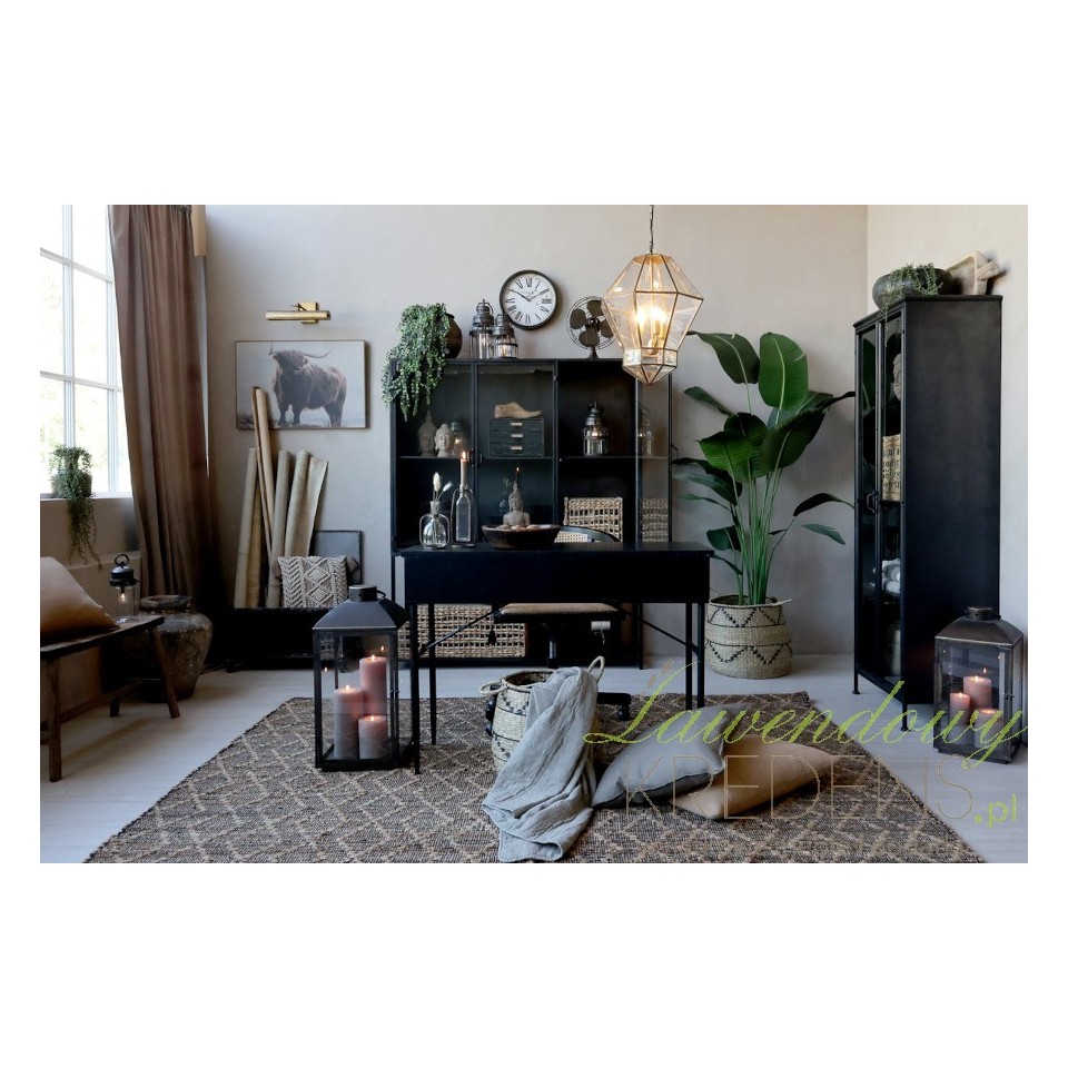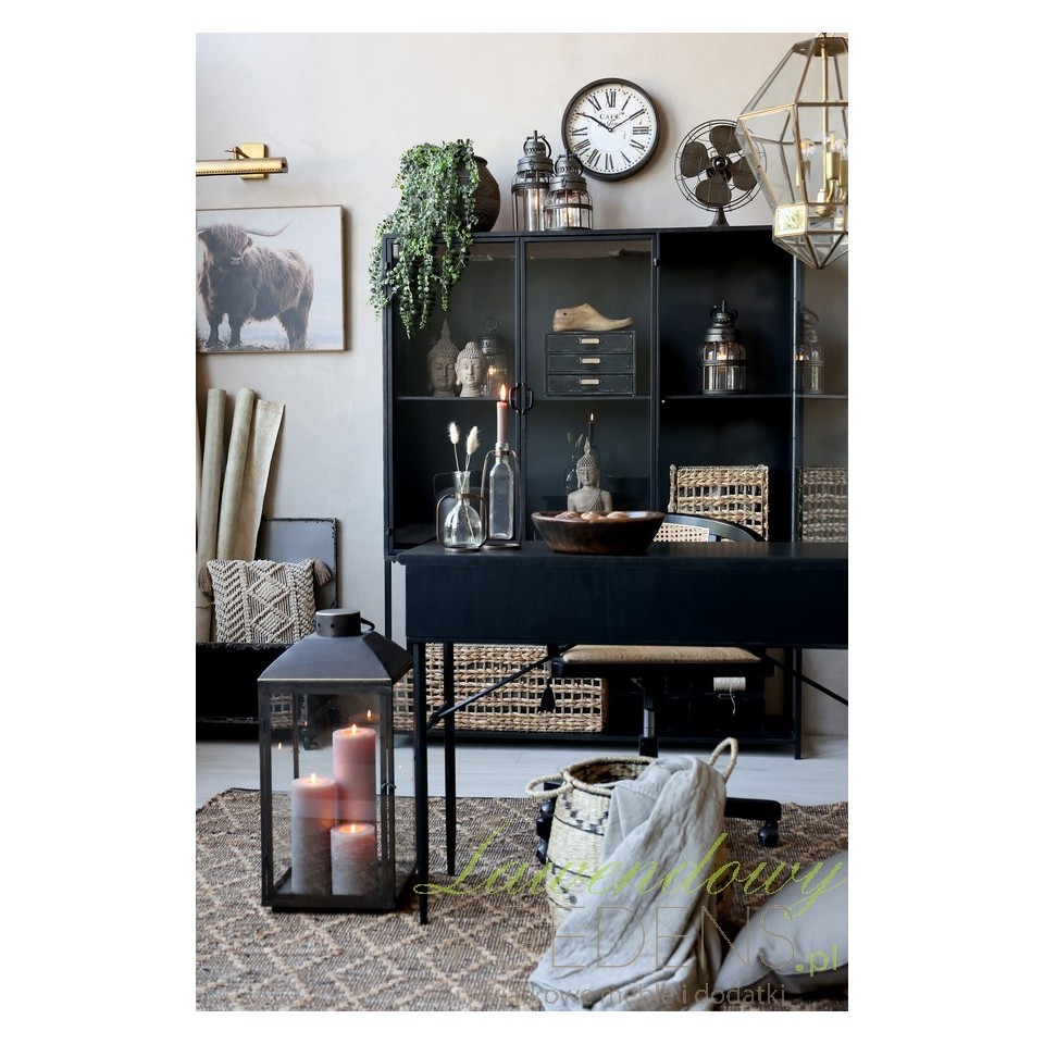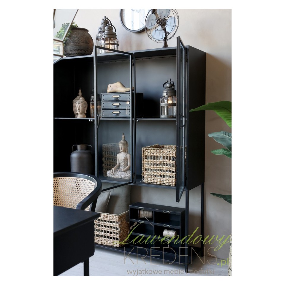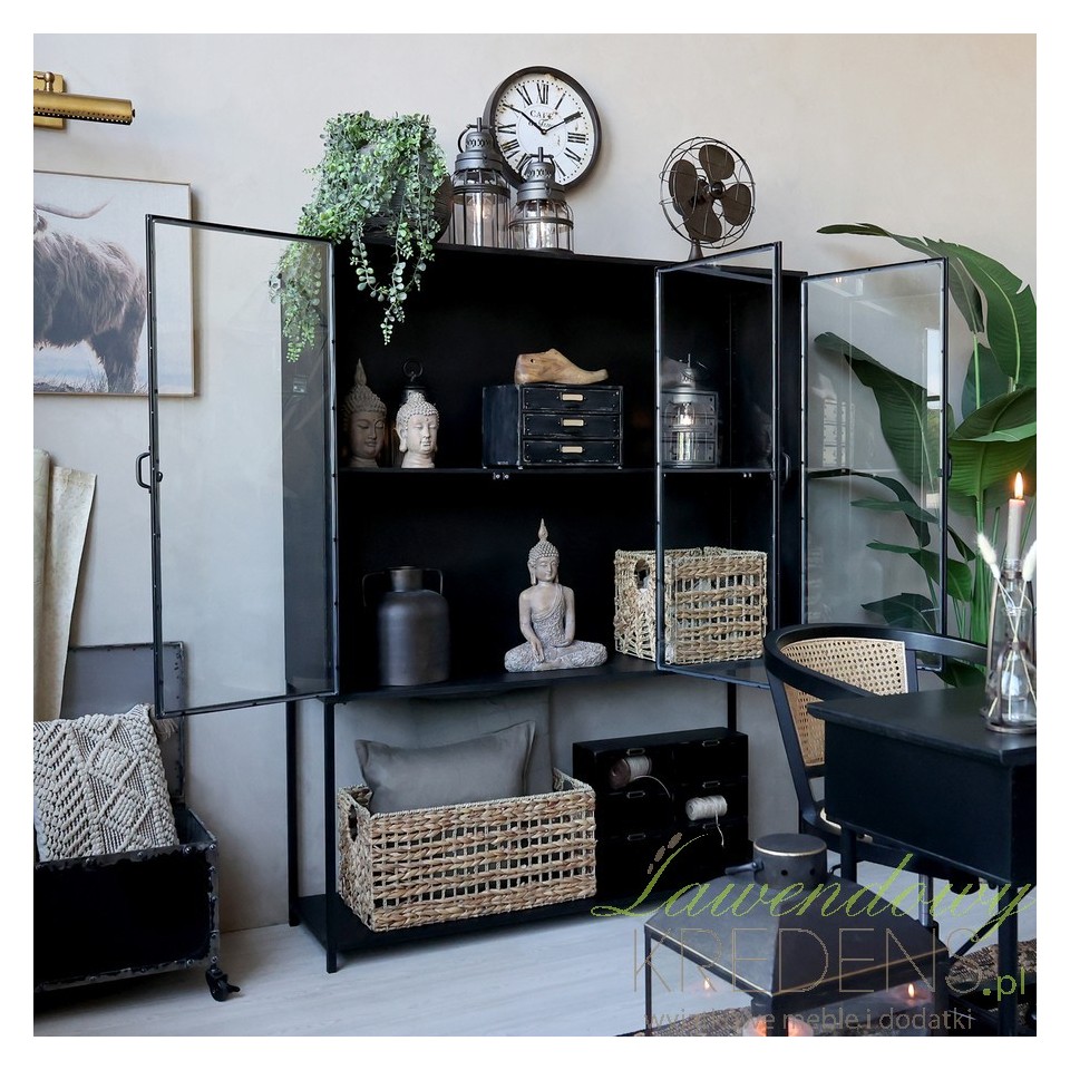 Antyczna czerń, w jakiej utrzymana jest konstrukcja, dodaje głębi i elegancji, a jednocześnie pozwala łatwo łączyć mebel z innymi elementami wyposażenia. Można zestawić ją z surowym drewnem, betonem, naturalnym lnem lub bambusowymi dodatkami, uzyskując efekt modnego kontrastu między chłodnym minimalizmem a przytulnym wystrojem. Dzięki swojemu uniwersalnemu wyrazowi witryna odnajdzie się zarówno w typowo loftowych wnętrzach, jak i w bardziej eklektycznych przestrzeniach z nutą boho lub retro.