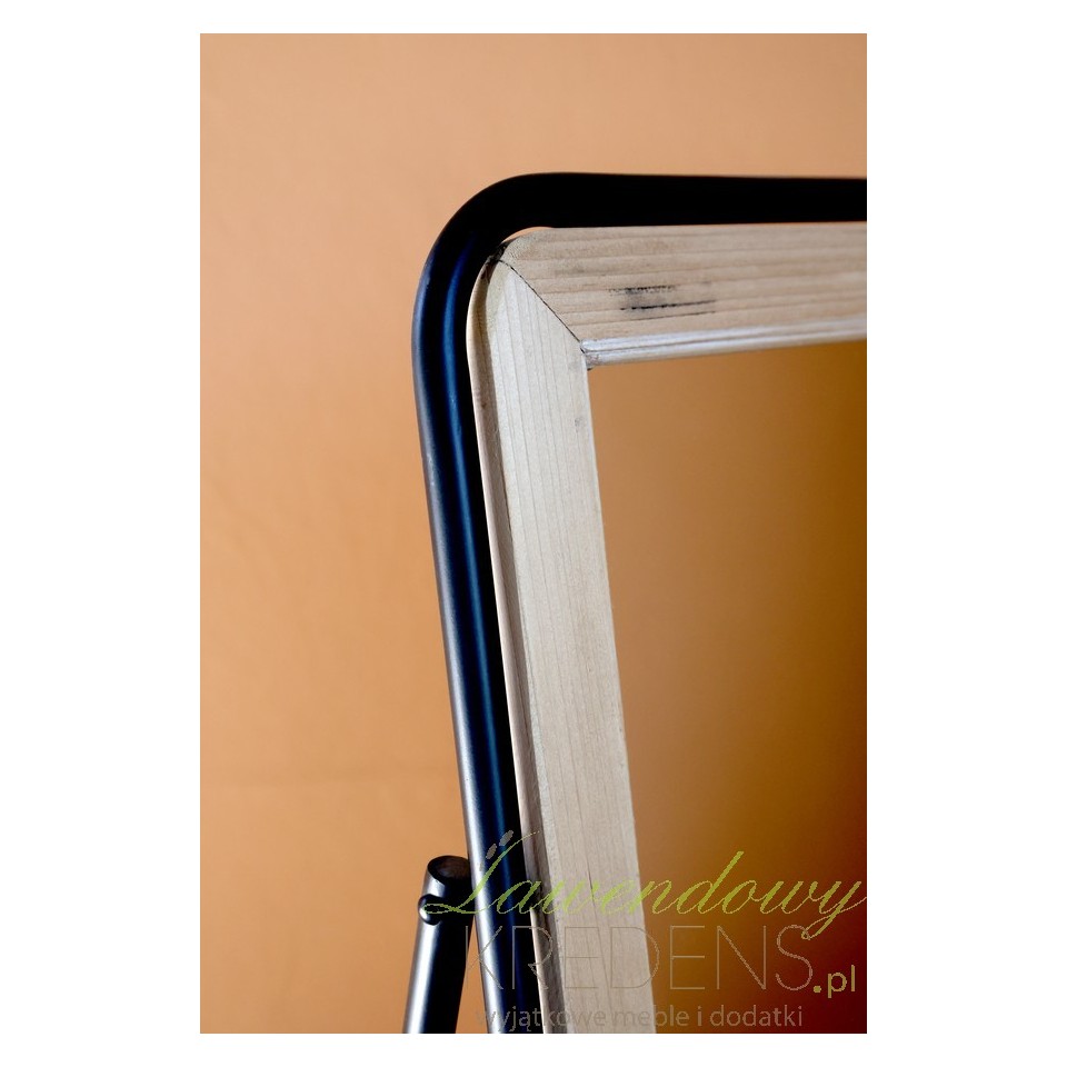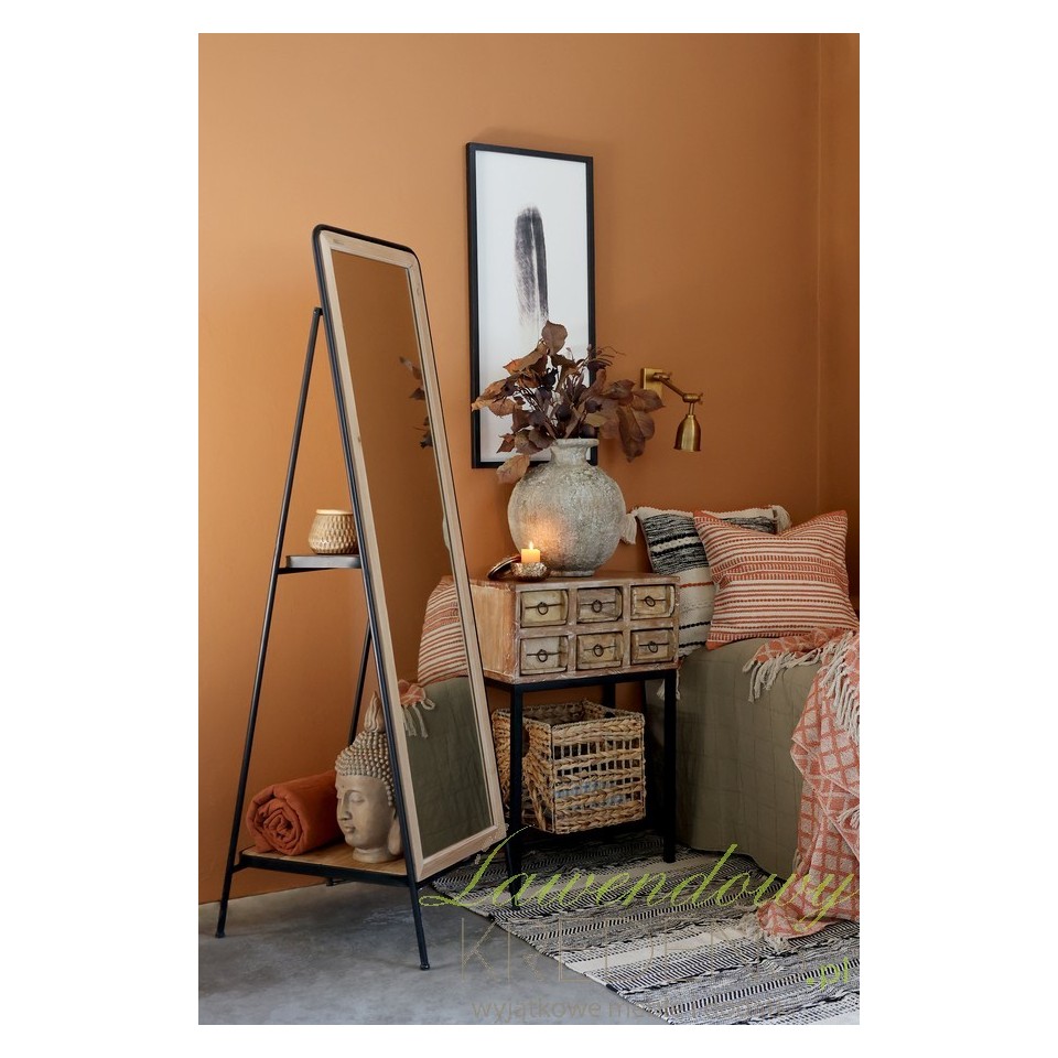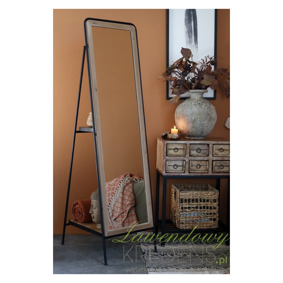 To lustro o wysokości 168 cm i szerokości 55 cm zostało zaprojektowane z myślą o funkcjonalności i estetyce. Posiada stabilną, metalową konstrukcję w czarnym kolorze oraz ozdobną ramę wykonaną z drewna jodłowego, utrzymaną w naturalnym brązie. Wyposażone jest w praktyczne półki z tyłu – idealne do przechowywania kosmetyków, świec, dekoracji lub podręcznych przedmiotów, co czyni je meblem 2w1: pełnowymiarowym lustrem i regałem w jednym. To rozwiązanie idealne do mniejszych wnętrz, gdzie każdy centymetr przestrzeni ma znaczenie.