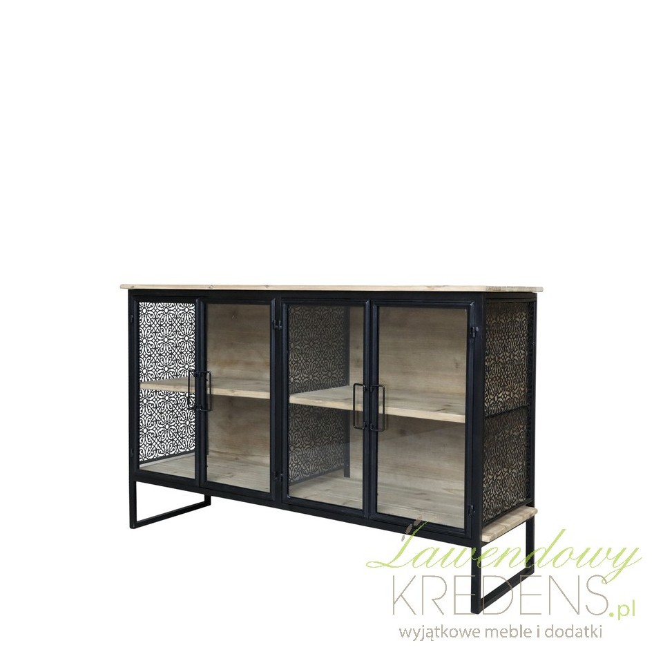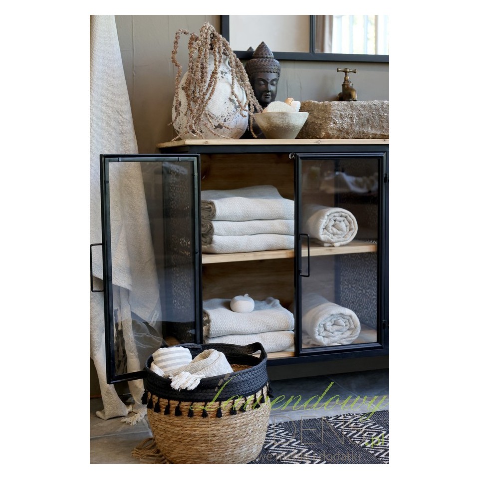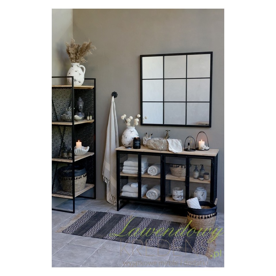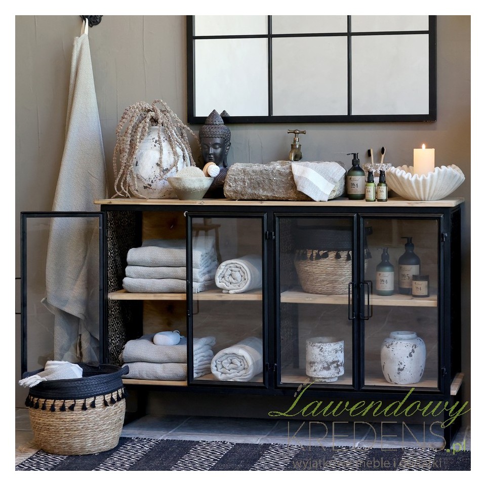 Wykonana z drewna jodły, metalu, szkła oraz mdf, komoda Vence zachwyca swoim surowym, ale wyrafinowanym wyglądem. Czarne, stalowe ramy tworzą zarys industrialnej bryły, a przeszklone fronty nadają meblowi lekkości i sprawiają, że jego zawartość staje się częścią aranżacji. Dzięki wymiarom 80 cm wysokości, 121 cm szerokości i 38 cm głębokości, mebel doskonale sprawdzi się zarówno w większych, jak i mniejszych przestrzeniach – od loftowego salonu, przez funkcjonalny przedpokój, aż po stylową łazienkę.