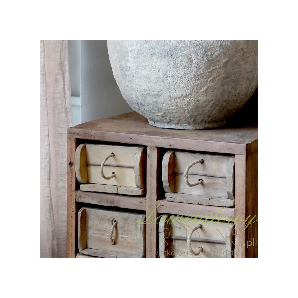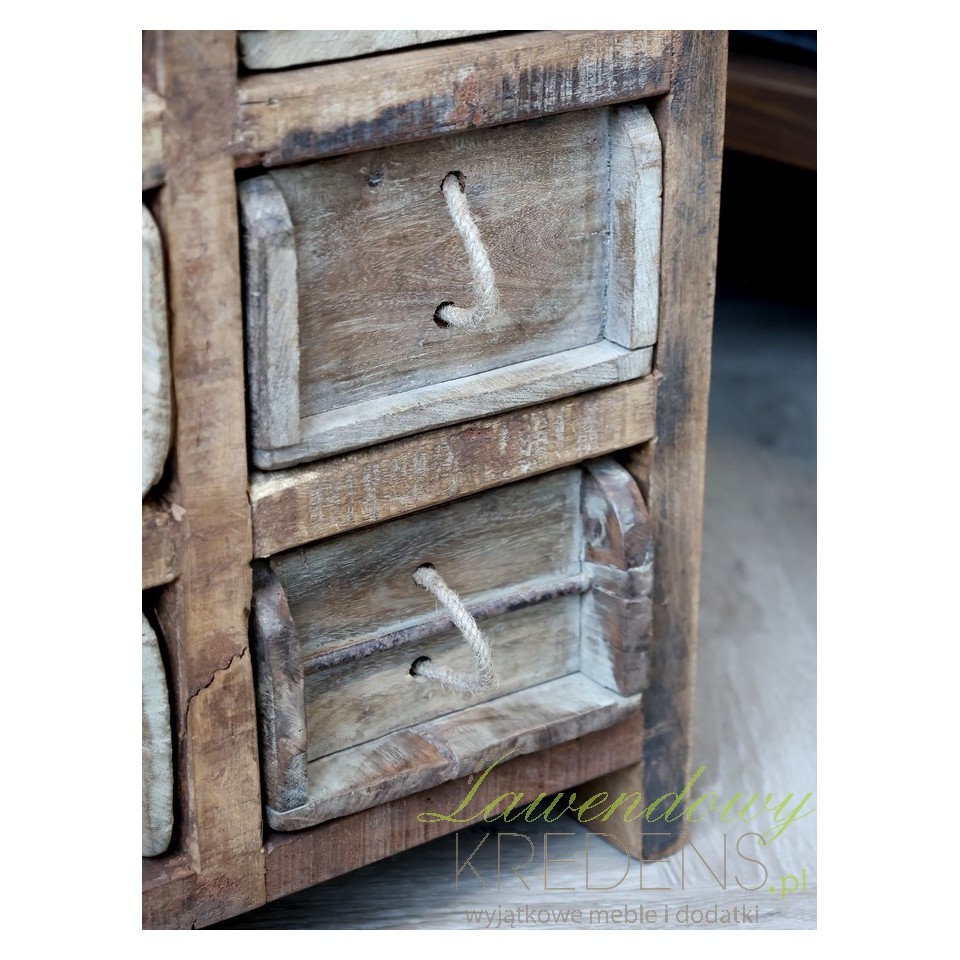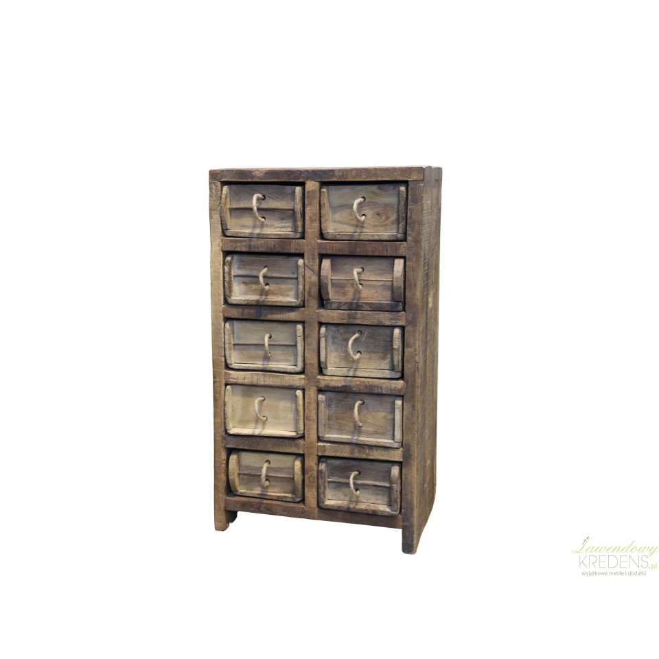 Wyjątkowa, drewniana szafka w stylu rustykalnym z kolekcji Grimaud Chic Antique, której dziesięć szuflad to autentyczne formy ceglane, wcześniej używane do formowania cegieł. Szafka wykonana jest ze starego, odzyskanego drewna, w solidnej i pięknie jakości, pełnej duszy.Ciepły, brązowy kolor drewna wprowadza do wnętrza przytulny klimat i podkreśla naturalne piękno materiału.
