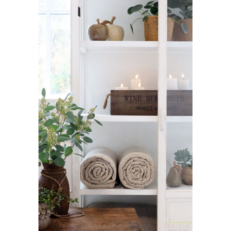 Witryna sprawdza się, gdy chcesz przechowywać zastawę, słoje lub tekstylia, ale nie chcesz widzieć „bałaganu na półkach”. Szkło porządkuje kompozycję optycznie, a podział na strefy ułatwia stylizację: wyżej ustaw dekoracje, niżej cięższe naczynia i kosze. **Stabilna bryła** pomaga bezpiecznie ustawiać wyższe przedmioty, np. wazony czy latarenki.Jak stylizować witrynę Chic Antique: świece, kosze, rośliny i ceramika