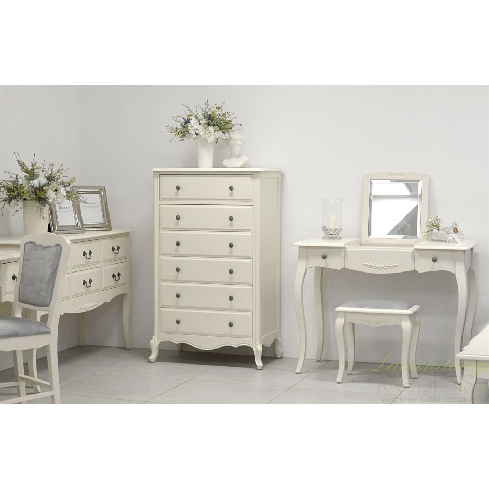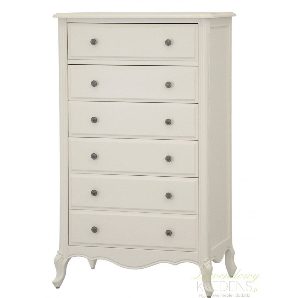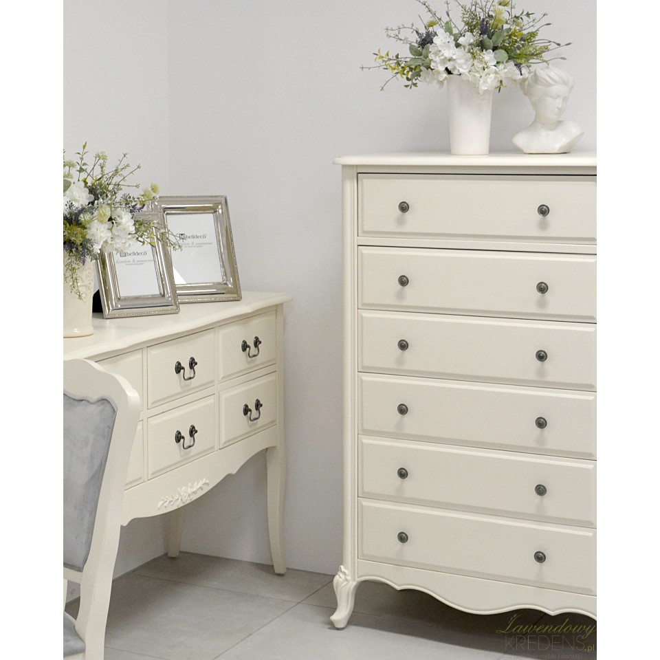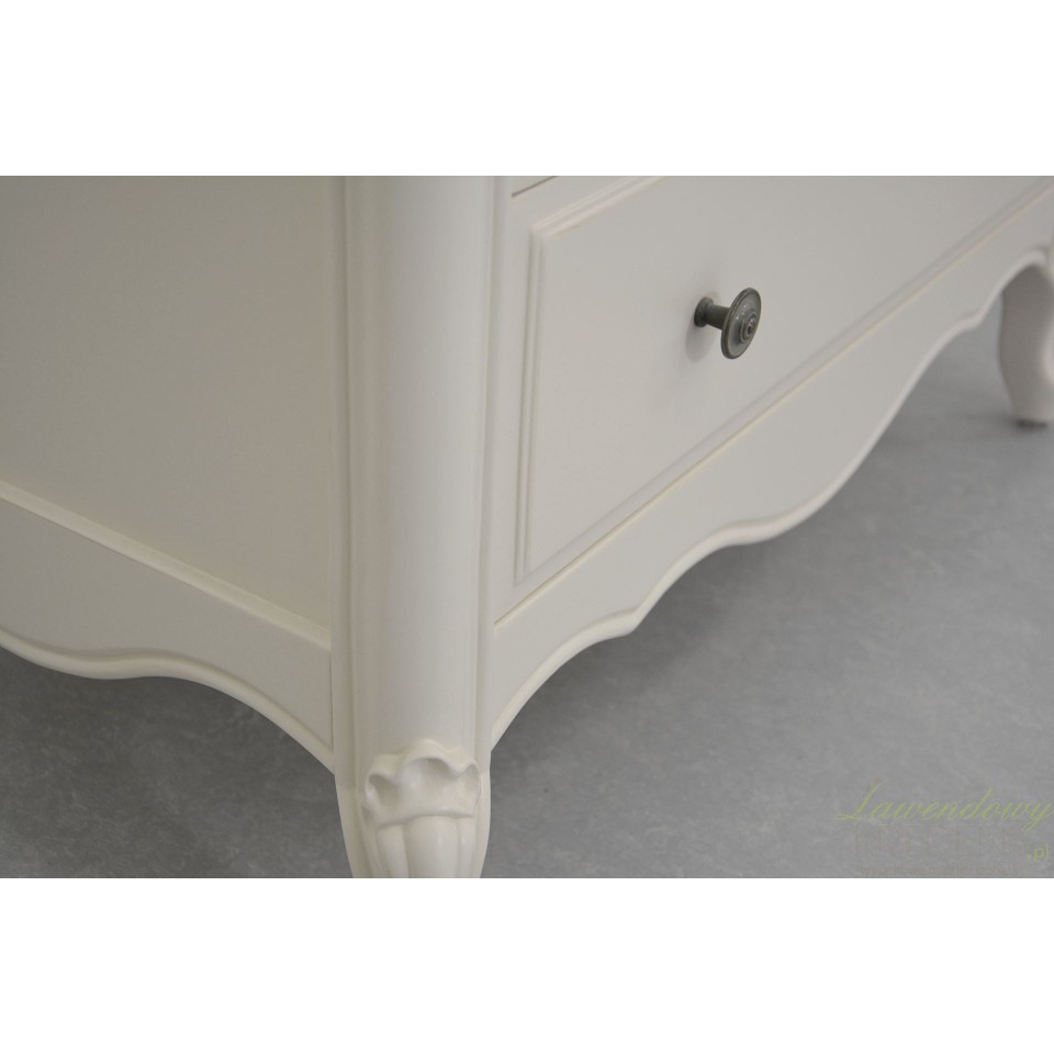 Komoda w stylu prowansalskim Dijon to kompaktowy mebel, który gwarantuje mnóstwo miejsca do przechowywania bielizny, pamiątek, bibelotów i wielu innych przedmiotów codziennego użytku. Podobnie jak pozostałe meble Livin Hill, prezentowana komoda stanowi ukłon w stronę pięknego i jednocześnie praktycznego wnętrza. Stylowe i jednocześnie solidne nóżki są fantazyjnie wygięte, ale co najważniejsze stanowią solidną podporę całego mebla. Sprawdź również pozostałe komody prowansalskie z kolekcji Dijon!