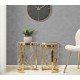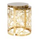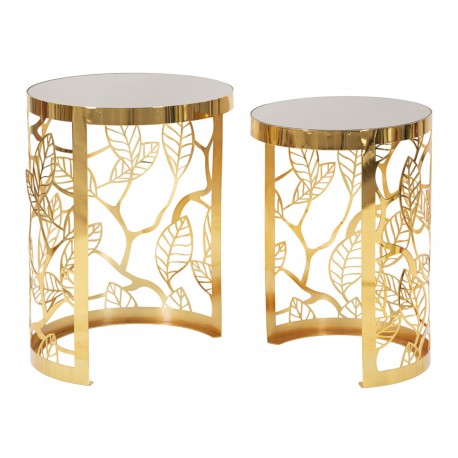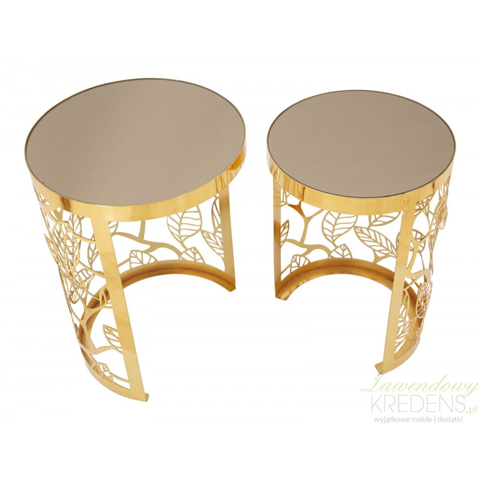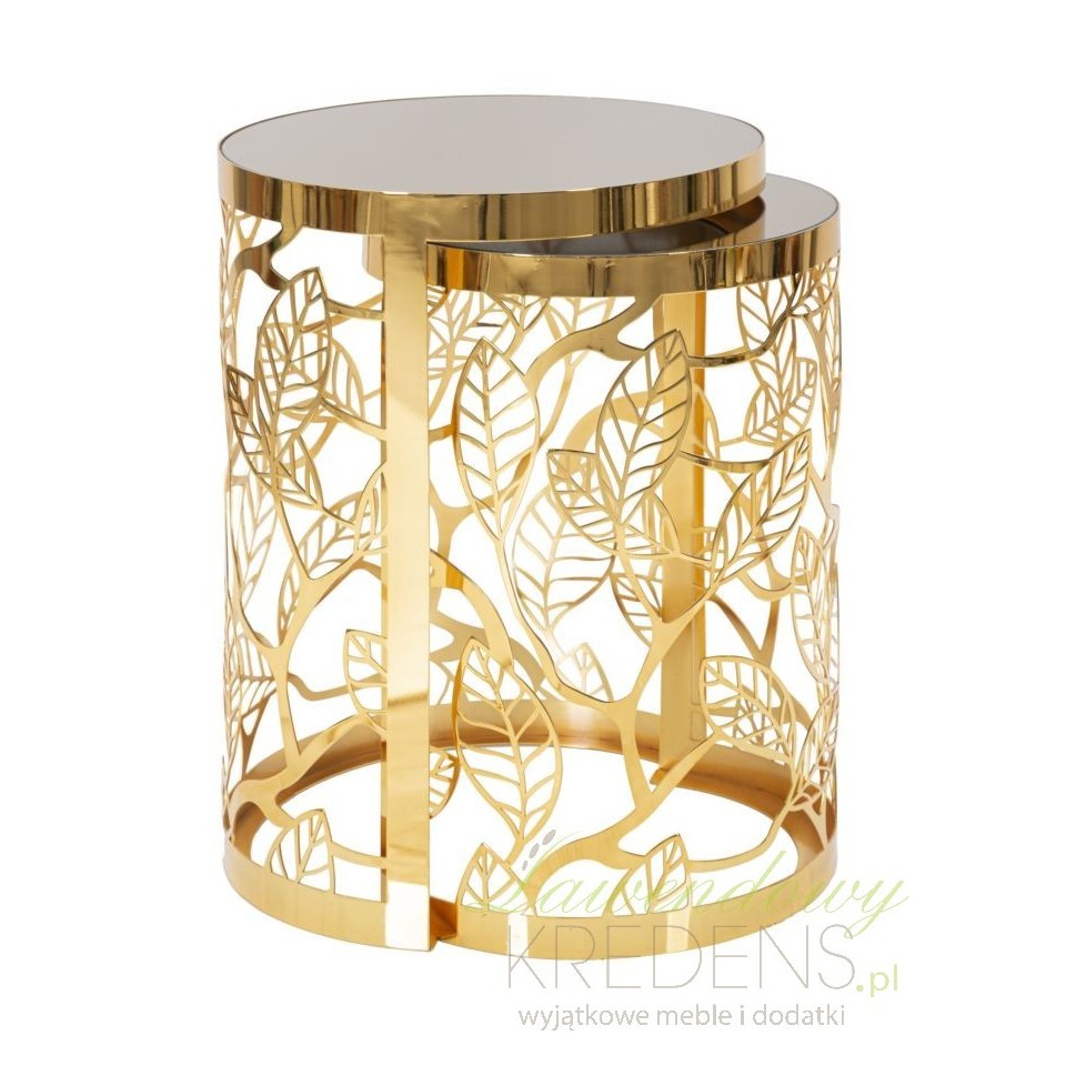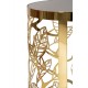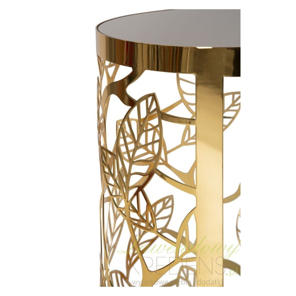 Filigranowa podstawa z motywem ażurowych liści jest zwieńczona szklanym blatem - oto złote stoliki metalowe Leaf Mauro Ferretti.