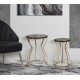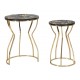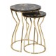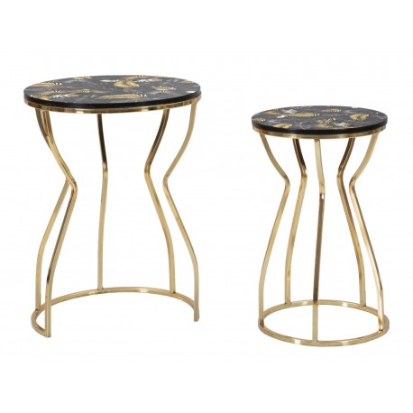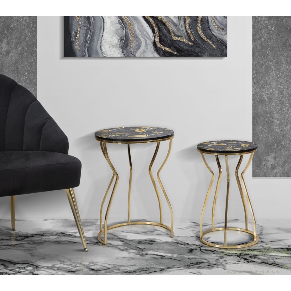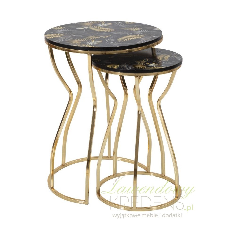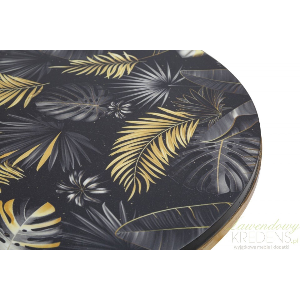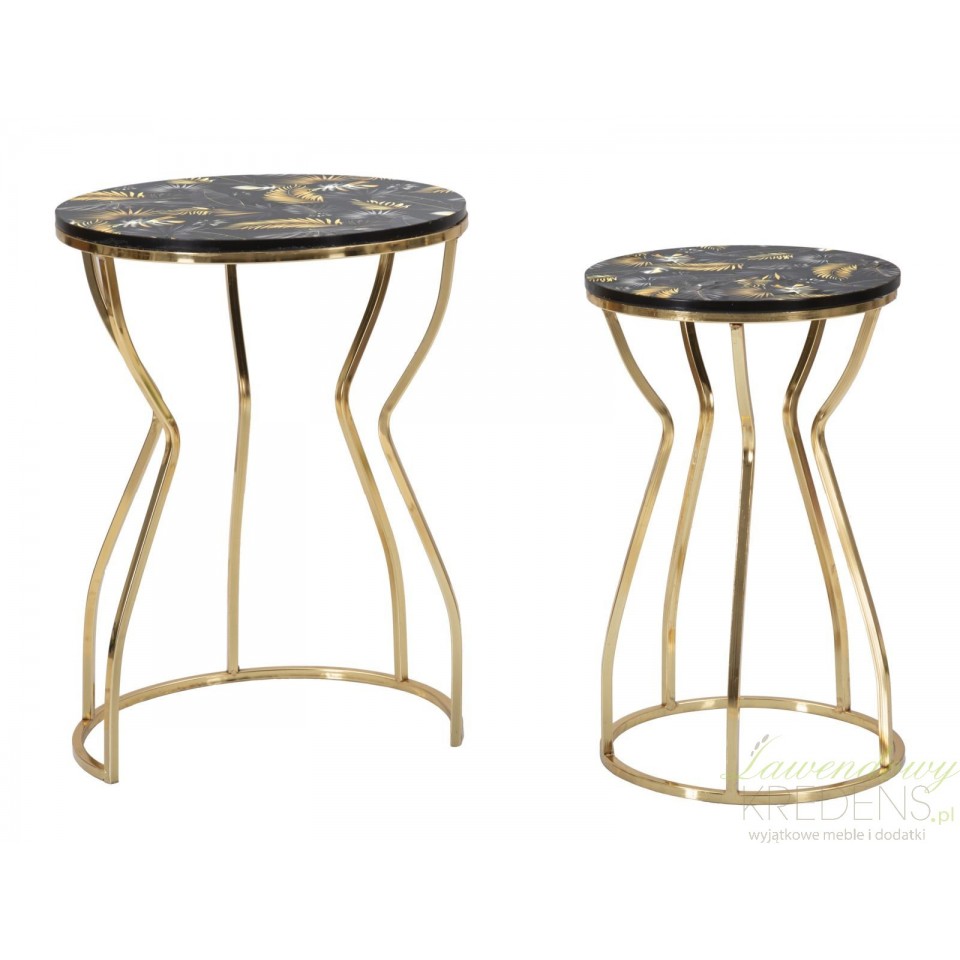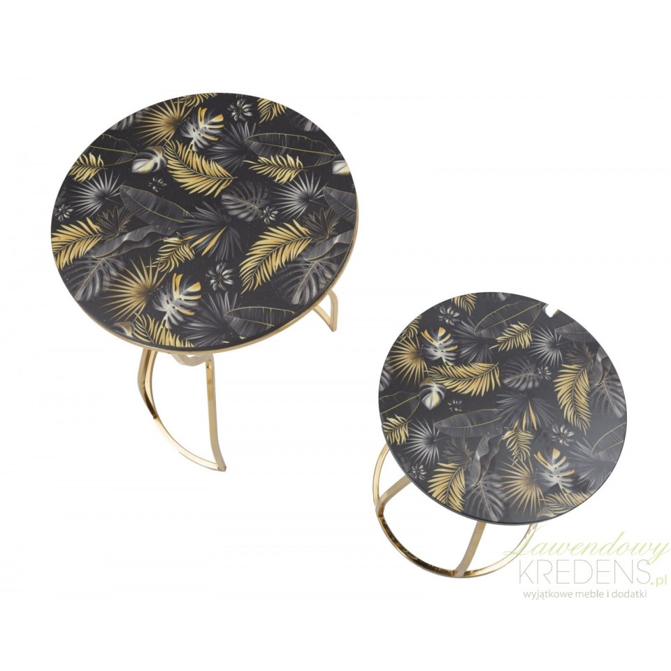 Oto wykonane z trwałych materiałów, dwa złote stoliki metalowe Leaf z podstawą zbliżoną kształtem do klepsydry i z wyjątkowym blatem z matowym wykończeniem. Na blatach naniesiono oryginalną grafikę inspirowaną egzotyczną dżunglą - złote, szare i czarne liście, wyglądające jakby kołysały się na wietrze. Jeśli chcesz zachować nienaganny wygląd mebli przez długie lata, pamiętaj aby natychmiast usuwać wszelkie zanieczyszczenia, w szczególności rozlane płyny. Złote meble Glamour to pewność, że aranżacja wnętrza jest na najwyższym, światowym poziomie.