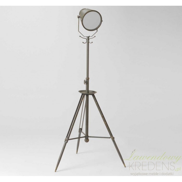 Oryginalny wieszak w stylu industrialnym został wykonany z metalu i pokryty szarą farbą, która nadaje mu chłodnego charakteru. Podstawą wieszaka jest trójnóg, a jego górna część to klosz, który ma lustrzaną taflę pod spodem. Pod kloszem zamontowano kilka haczyków, na których śmiało zawiesisz okrycia wierzchnie i szale. Dodatki w stylu industrialnym dzięki unikatowym kształtom doskonale nadają się różnego typu wnętrz.