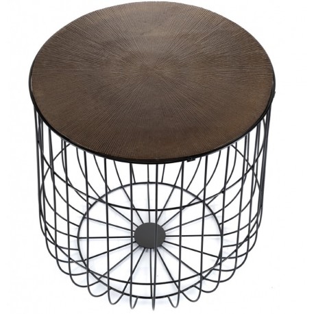 Stolik Aluro z ciemnego drewna i metalu wykonany jest w formie kosza z charakterystyczną przykrywą.