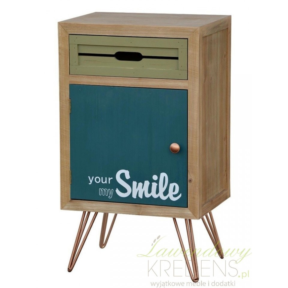 Nieduża szafka retro Portofino wykonana jest z drewna jodłowego. Surowy, niepomalowany korpus doskonale wpisuje się w klimat mebli skandynawskich i loftowych. To co wyróżnia tę serię mebli Livin Hill to kolorowe fronty. Szafka retro Portofino posiada jedną szufladę z zielonym frontem i ciekawie wkomponowanym wycięciem na uchwyt. Na drzwiczkach do szafki znajduje się biały napis. Zastosowanie trzech różnych rodzajów czcionki daje bardzo ciekawy efekt, a biały kolor przełamuje gładką niebieską powierzchnię frontu. Całości dopełniają metalowe nóżki i uchwyt, których błyszczące powierzchnie w kolorze miedzi ożywiają surowy wygląd tego mebla w tylu skandynawskim.