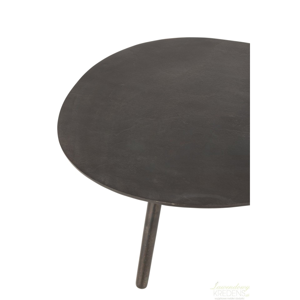 Proste nogi stolika stanowią dla niego bezpieczne podparcie i są dyskretne, dzięki czemu nietypowa, opływowa powierzchnia blatu skupia na sobie całą uwagę. Nasz metalowy stolik kawowy Drop łączy w sobie proste wzornictwo i solidne, metalowe elementy, zapewniając wygląd zgodny z aktualnymi trendami. Cała konstrukcja tego mebla ma subtelnie postarzane wykończenie, przejawiające się w postaci nierówności na blacie. Ustaw stolik obok fotela lub sofy w salonie, aby trzymać na nim ulubioną lampę, kilka ramek na zdjęcia i tacę na filiżankę z kawą lub wazon z kwiatami. Meble J-Line są wyjątkowo piękne!