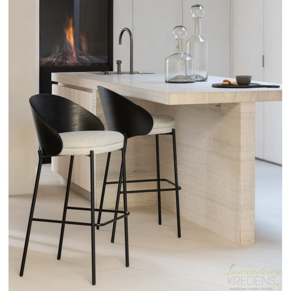 Wysokie krzesło barowe w uniwersalnej kolorostyce, stojące na metalowych nogach. Meble Japandi to produkty, które zachwycą każdym swoim szczegółem. Zachęcamy do poznania tych i wielu innych propozycji mebli i dodatków.