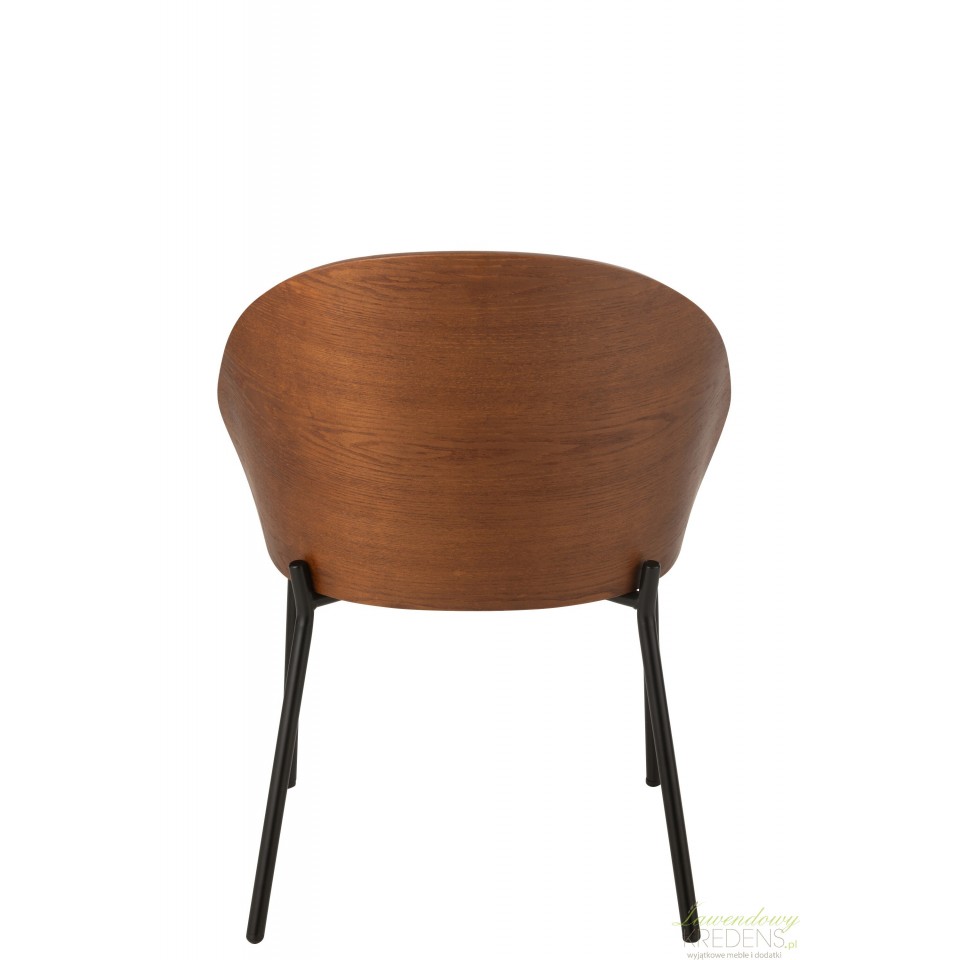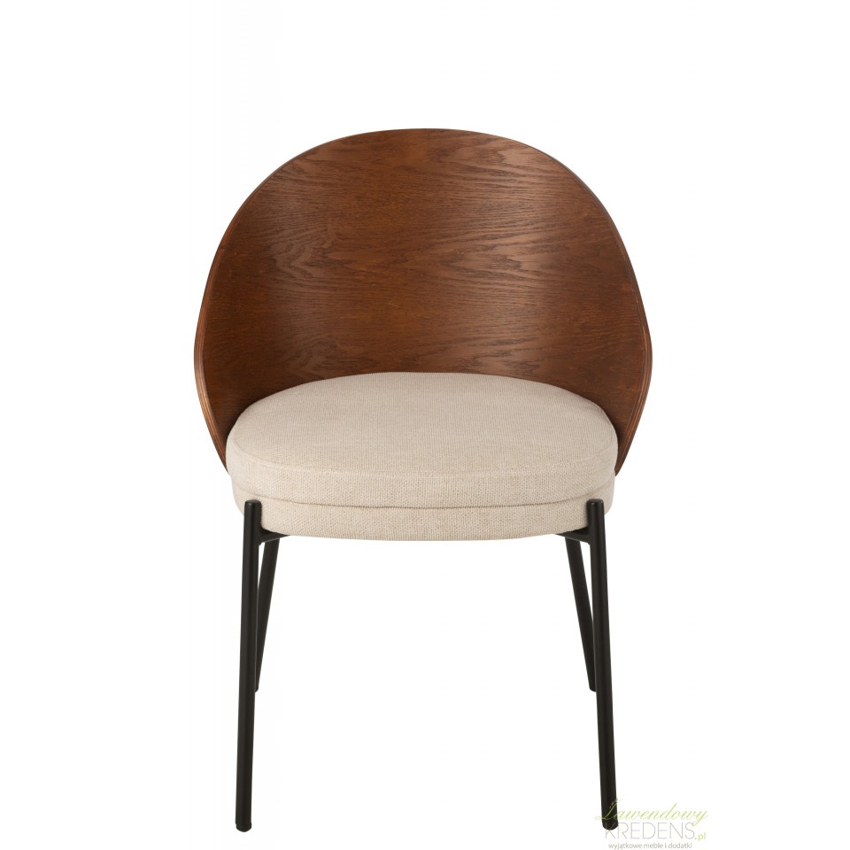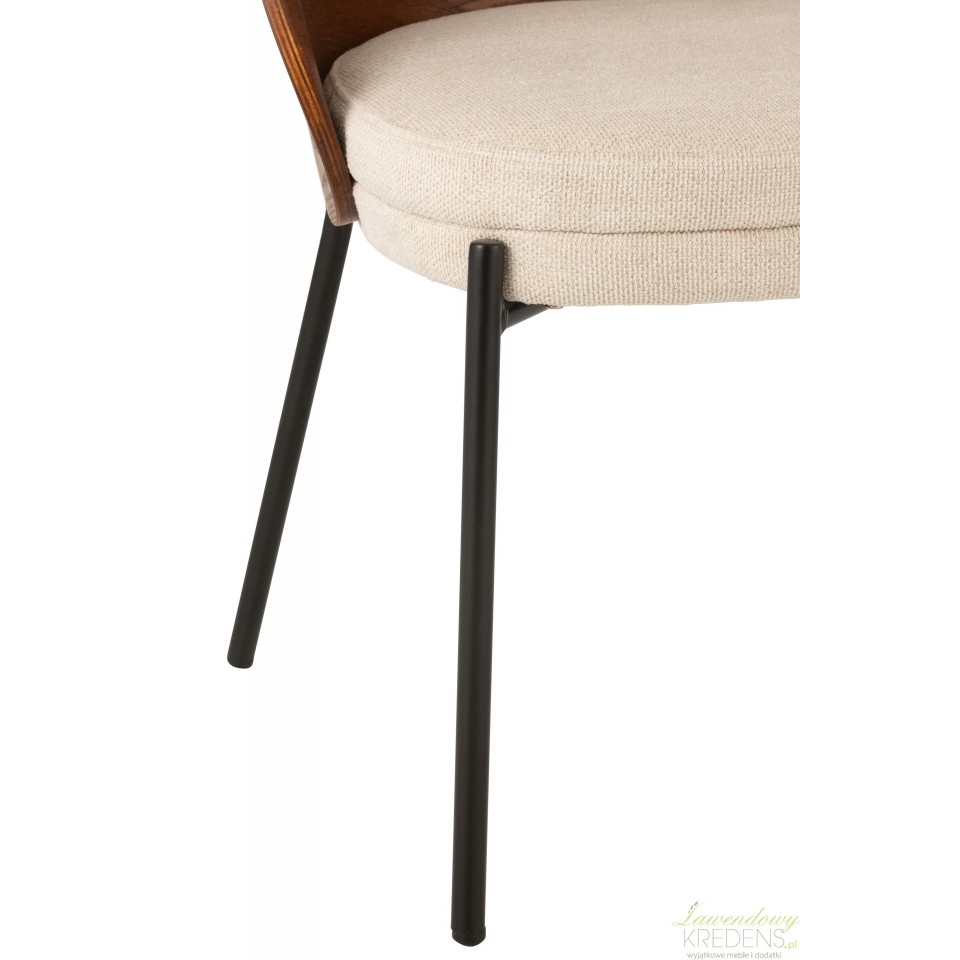 Elegancki mebel w postaci krzesła w intensywnym odcieniu drewna na którym widoczne są piękne słoje. Beżowe siedzisko zapewni niezwykły komfort podczas spotkań na przykład w nowoczesnym salonie.