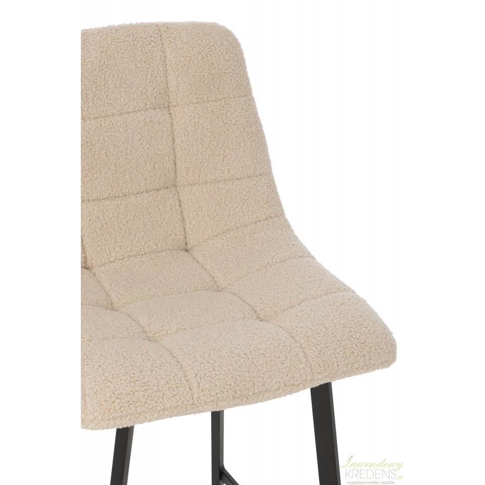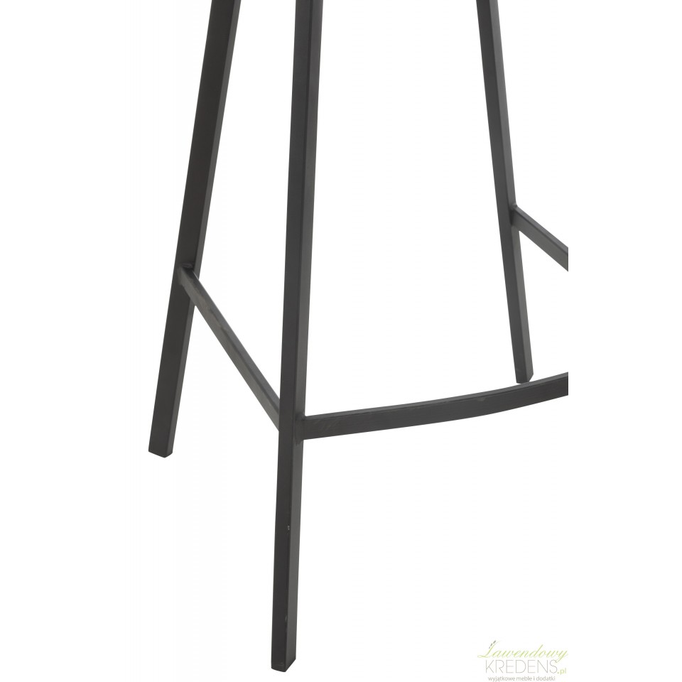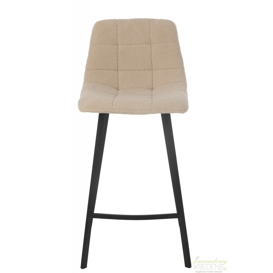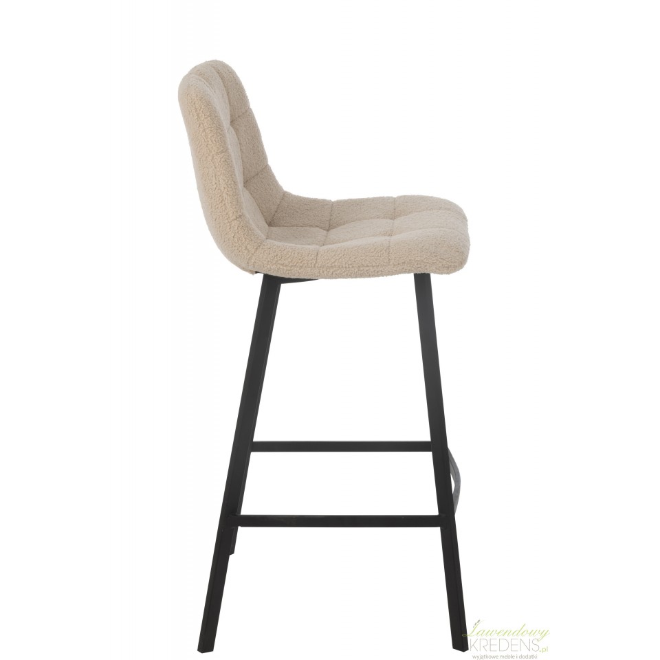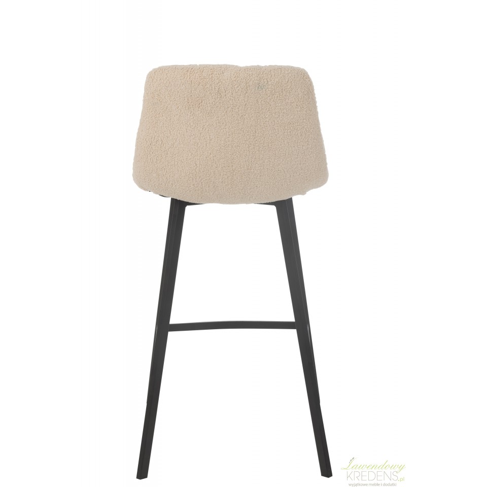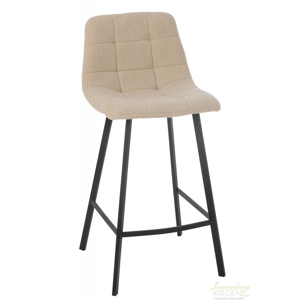 Beżowy stołek barowy na wysokich metalowych nogach w kolorze czarnym. Kontrastowa kolorystyka tego mebla nadaje mu uniwersalności.