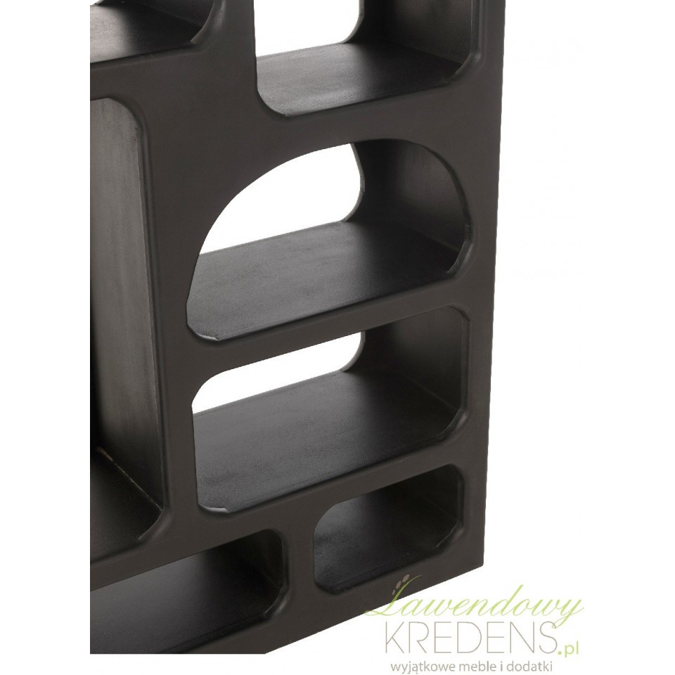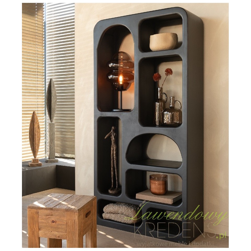 Każdy egzemplarz powstał z drewna mango, cenionego za wytrzymałość, głęboki kolor i widoczne usłojenie. Czarne wykończenie podkreśla jego współczesny charakter, a jednocześnie wydobywa subtelną strukturę surowca. Regał ma wysokość 162 cm, szerokość 89 cm i głębokość 33 cm, dzięki czemu idealnie sprawdzi się w salonie, biurze czy sypialni – jako miejsce na książki, ceramikę, szkło lub dekoracje w stylu japandi.