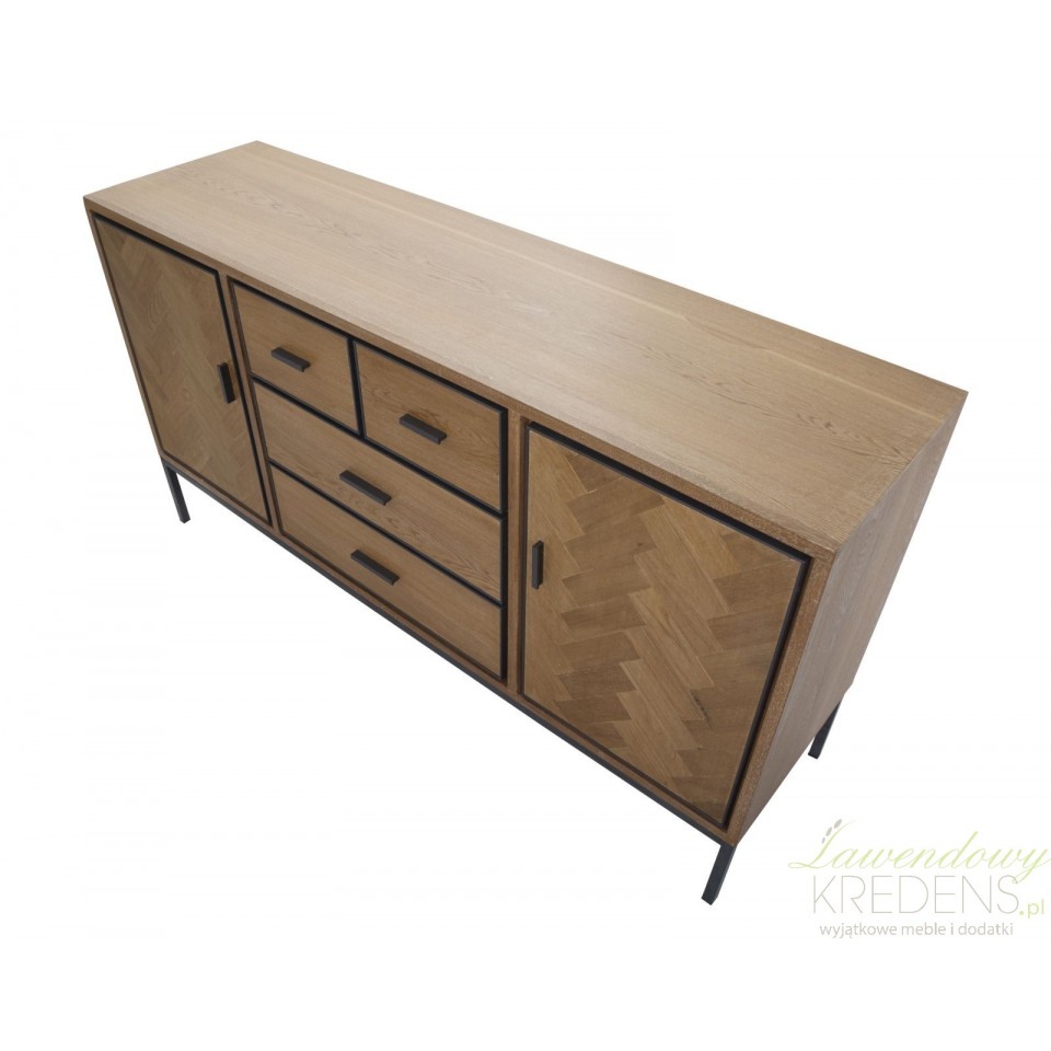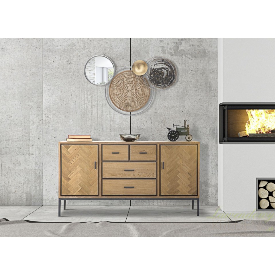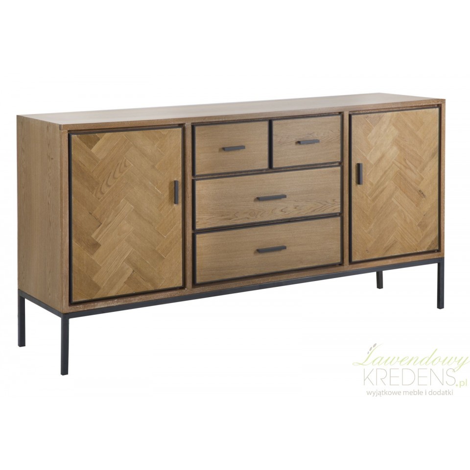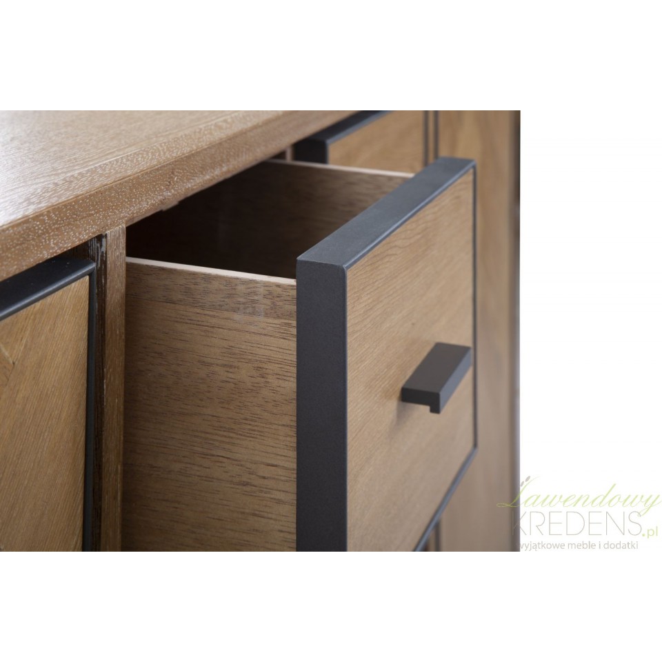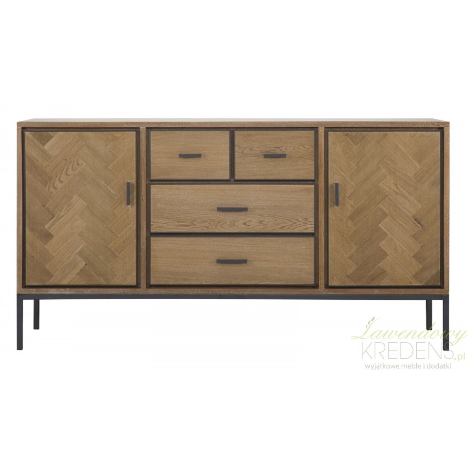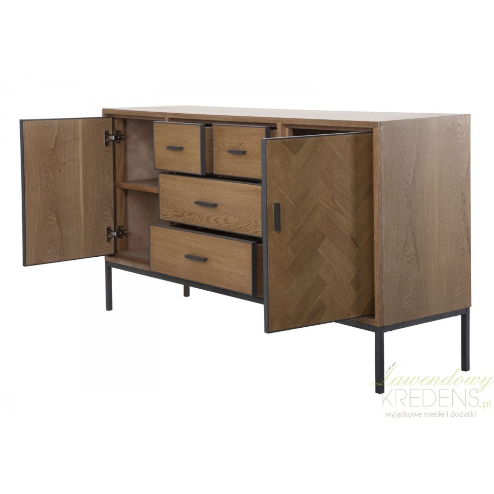 Szeroka komoda w stylu skandynawskim ma brązowy kolor, posiada dwie szafki po bokach i cztery szuflady pośrodku.