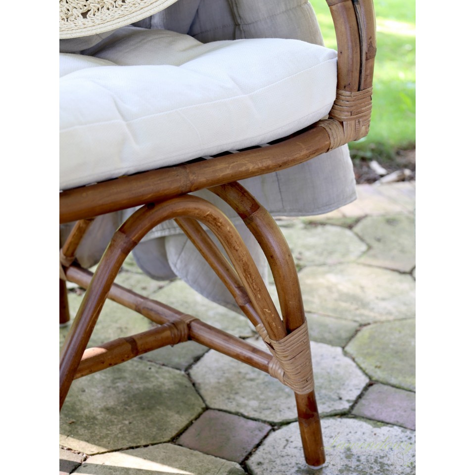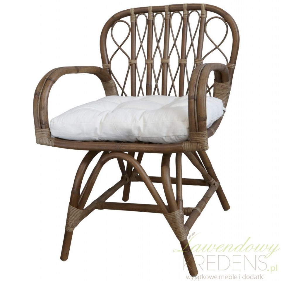 Przedstawiamy eleganckie, rattanowe krzesło Chic Antique Anor z poduchą, zakrzywionymi nogami oraz wygodnym oparciem i podłokietnikami.