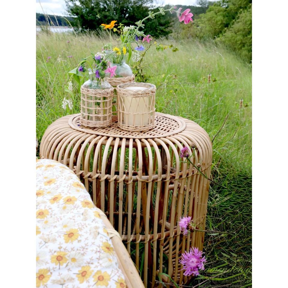 Ze względu na swoje proporcje – 50 cm wysokości i 50 cm średnicy – stolik świetnie sprawdzi się zarówno w małych przestrzeniach, jak i w dużych salonach, sypialniach czy nawet na tarasach. Można go ustawić obok fotela, łóżka lub kanapy, tworząc przestrzeń pełną ciepła i relaksu. Możliwość zestawienia go z innymi elementami w stylu skandynawskim lub boho sprawia, że stolik rattanowy jest wszechstronnym wyborem do różnych typów wnętrz.