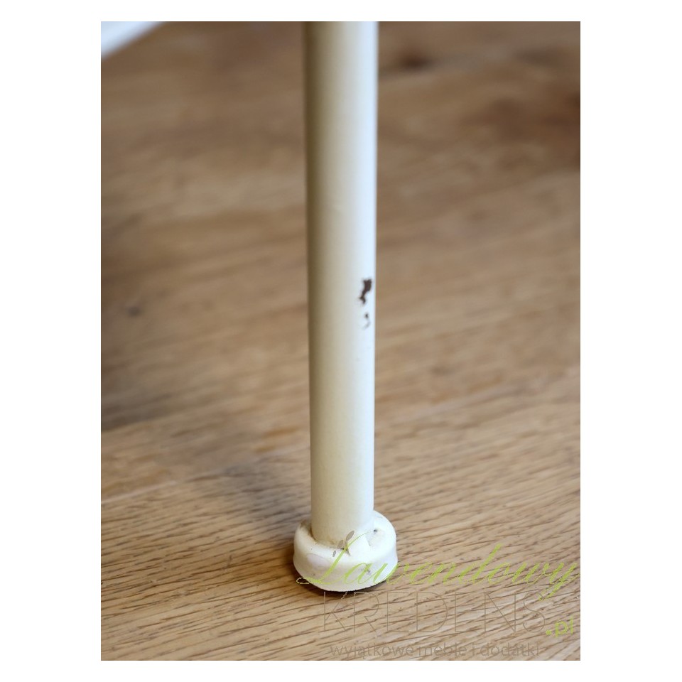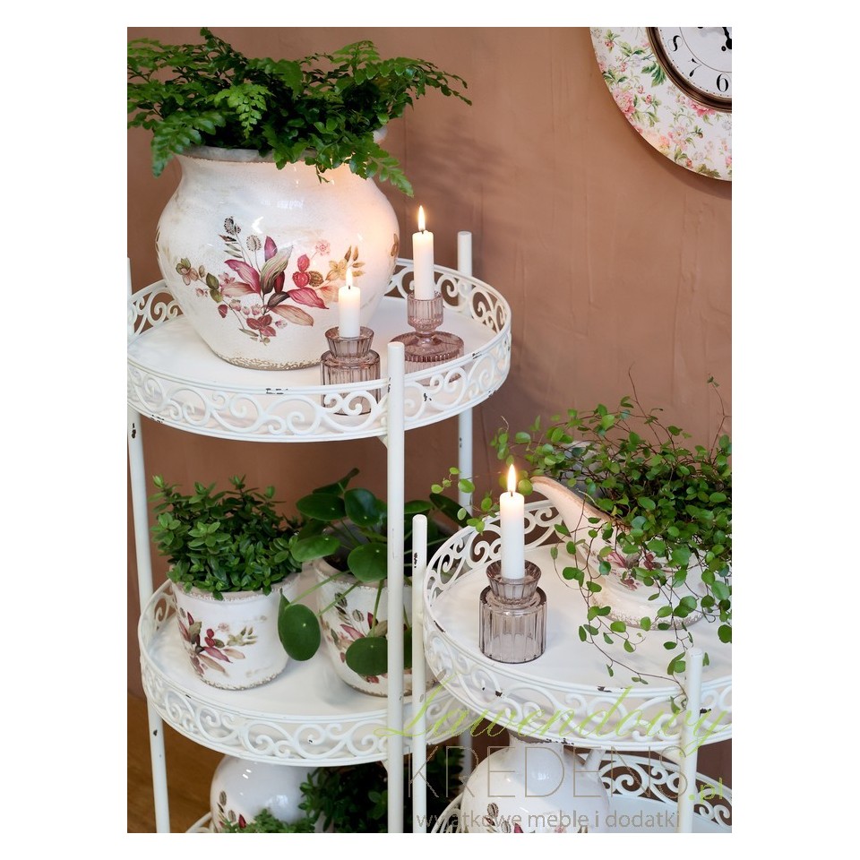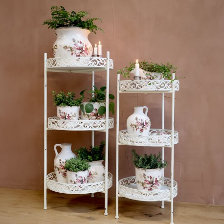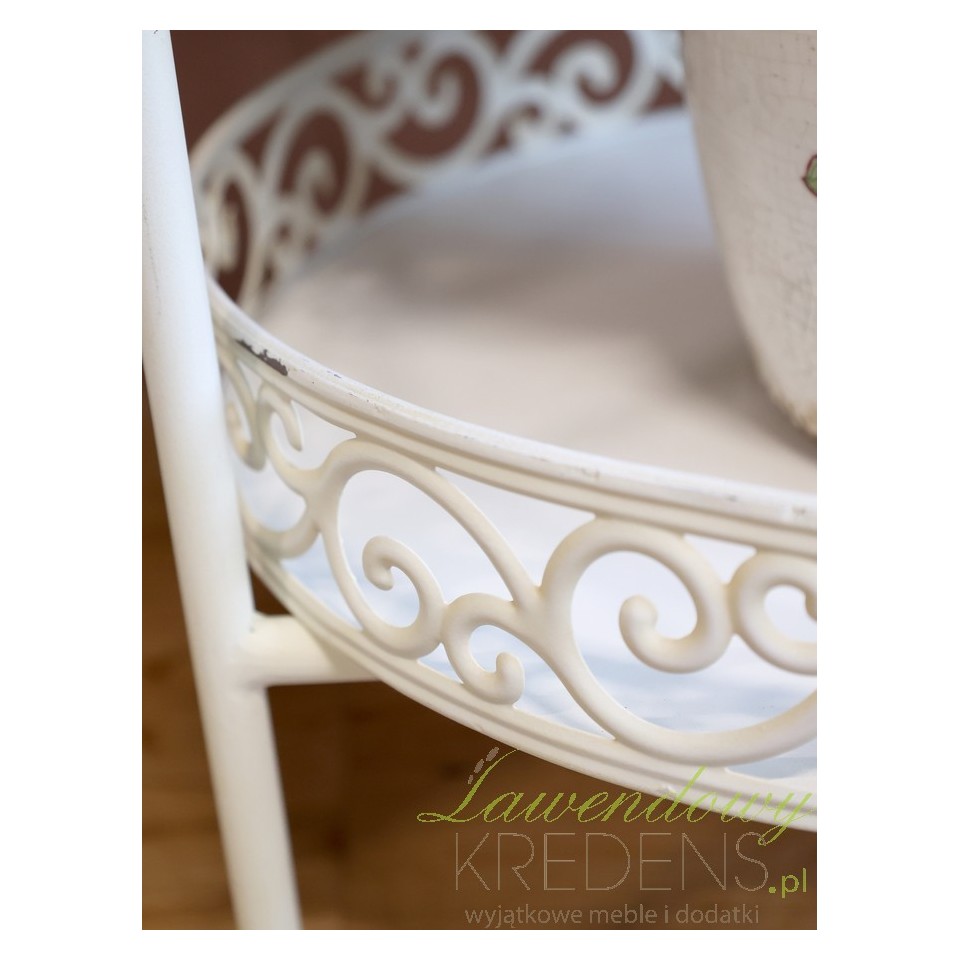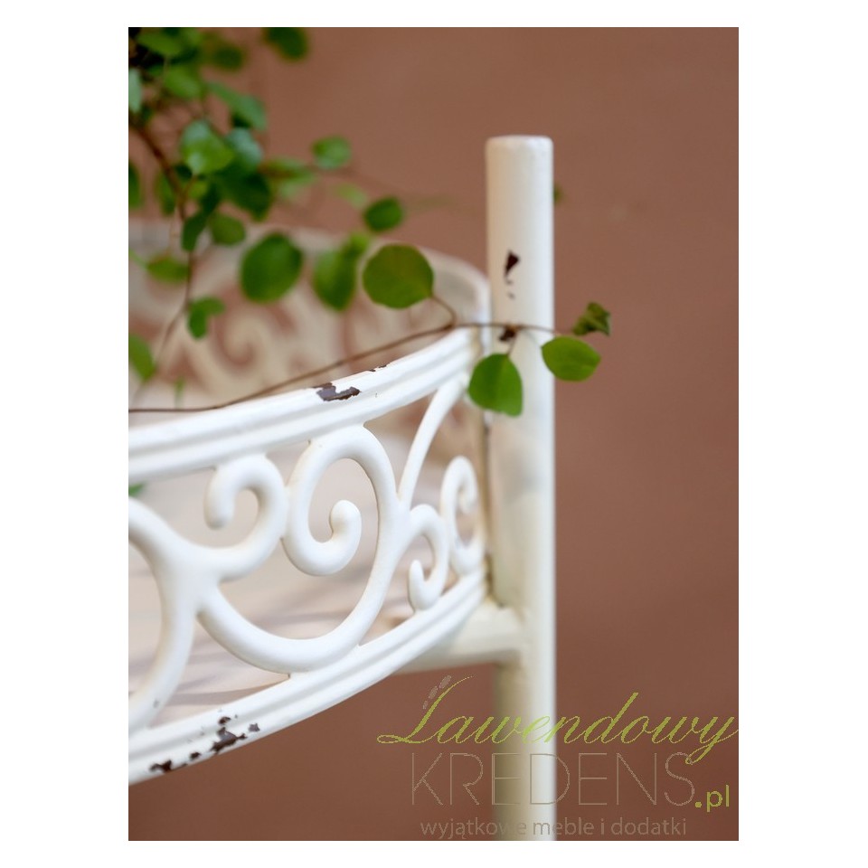 Metalowy regał/kwietnik prowansalski Chic Antique to wyjątkowy element wyposażenia wnętrza, który łączy funkcjonalność z subtelną elegancją stylu shabby chic. Ten dekoracyjny mebel przyciąga uwagę kremowym wykończeniem i finezyjnymi, ażurowymi detalami, wnosząc do wnętrza romantyczny klimat inspirowany południem Francji.