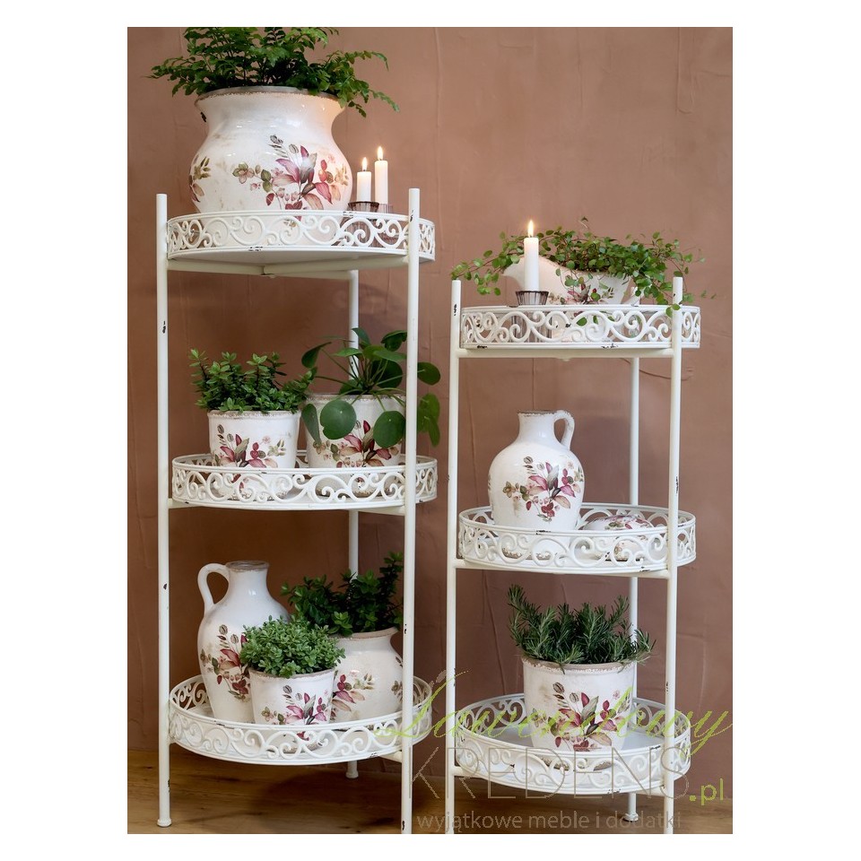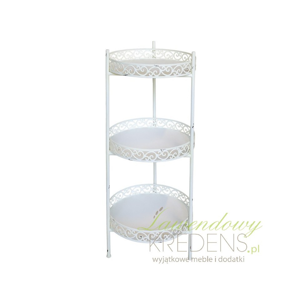 Regał ma wysokość 100 cm i został wyposażony w trzy okrągłe półki o średnicy 42,5 cm. Każda z nich oddzielona jest od kolejnej przestrzenią o wysokości 38 cm, co pozwala na swobodne ustawienie doniczek z wysokimi roślinami, dużych wazonów, świec czy dekoracyjnych przedmiotów. Delikatne metalowe zdobienia na rantach półek przywodzą na myśl romantyczne francuskie ogrody, dodając całości wyjątkowego uroku i lekkości.