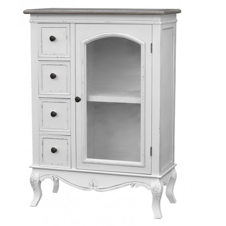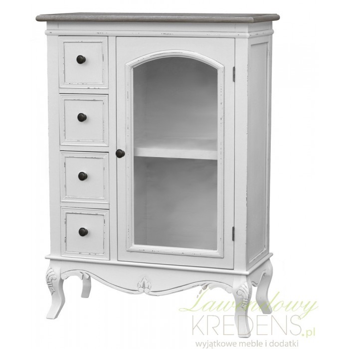Meble w stylu prowansalskim z kolekcji Rimini White są bardzo wyraziste i jednocześnie delikatne w swojej formie. Biała komoda zbudowana została z drewna oraz mdf, i wykończona symbolicznymi rzeźbieniami, znajdującymi się na wygiętych nóżkach i na cokole. Komoda podzielona została na dwie części – po jednej znajdują się cztery ustawione w rzędzie szufladki, a po drugiej przeszklona szafka z półką. Blat komody ma brązowy kolor.