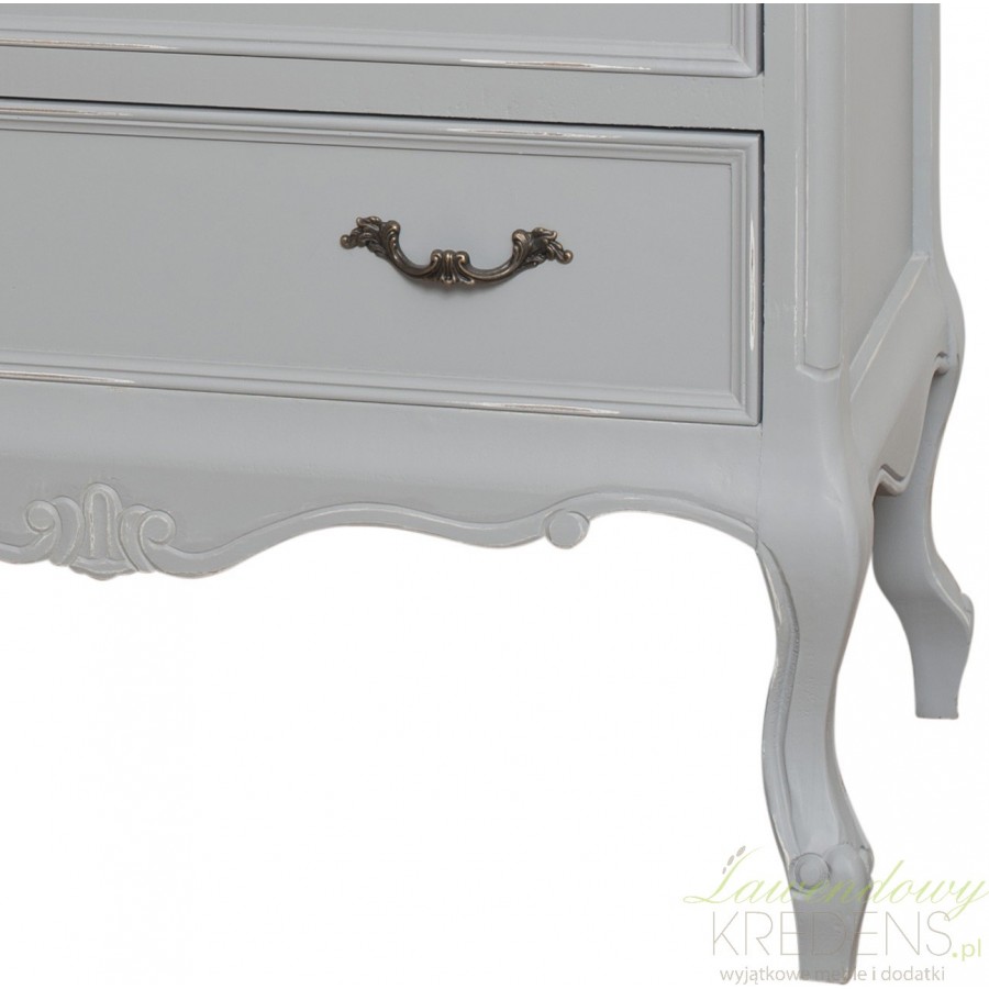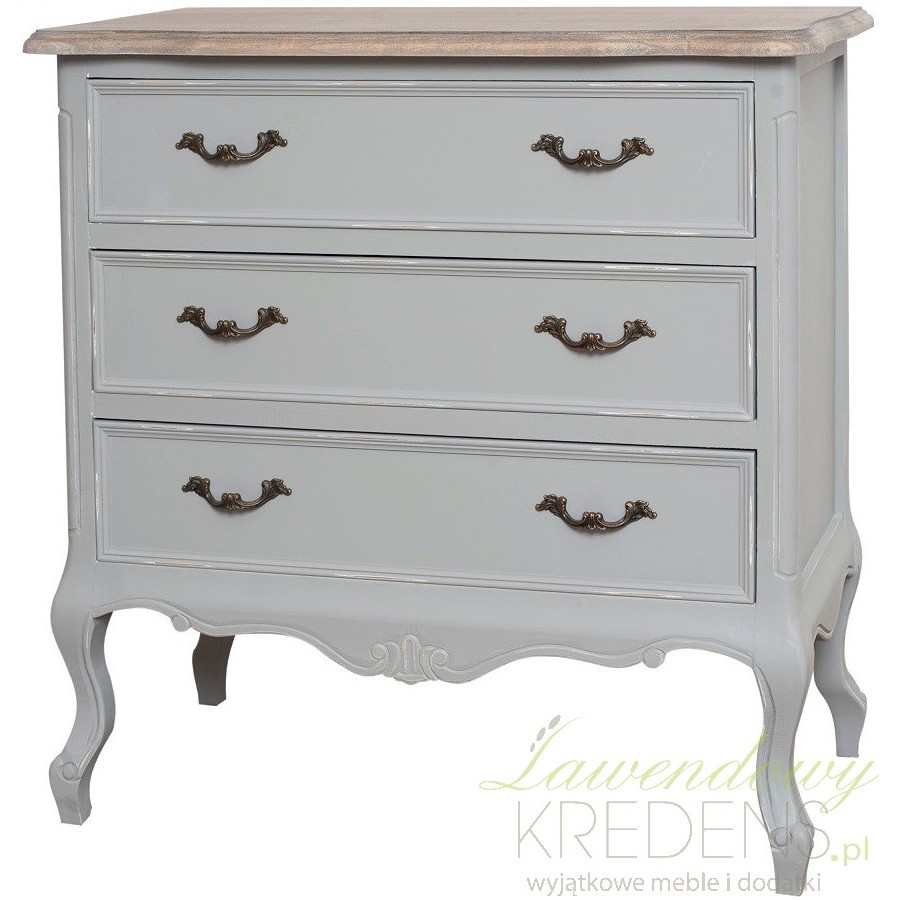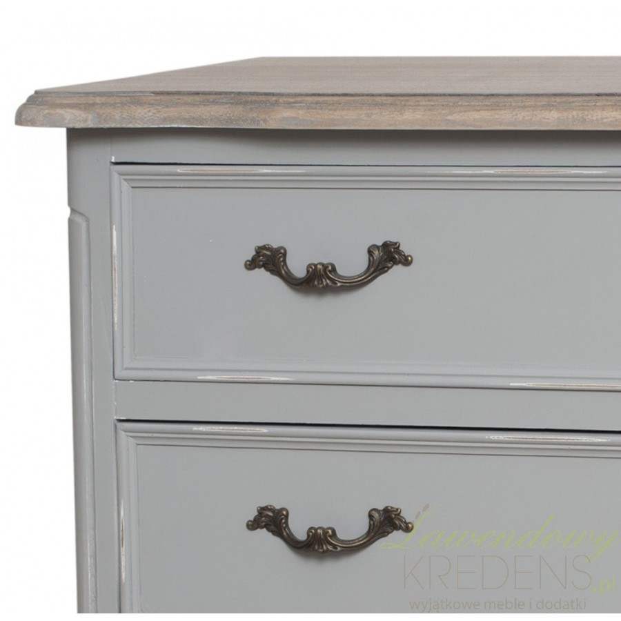 Średniej wielkości komoda w stylu prowansalskim z najnowszej kolekcji Catania, charakteryzującej się szarą powierzchnią boczną i naturalnie drewnianym blatem. Godne zapamiątania są też dolne, ciekawie wyglądające dekoracje, któe nadają komodzie lekkości i wdzięku. Trzy szuflady z pewnością zapewnią dużo miejsca!