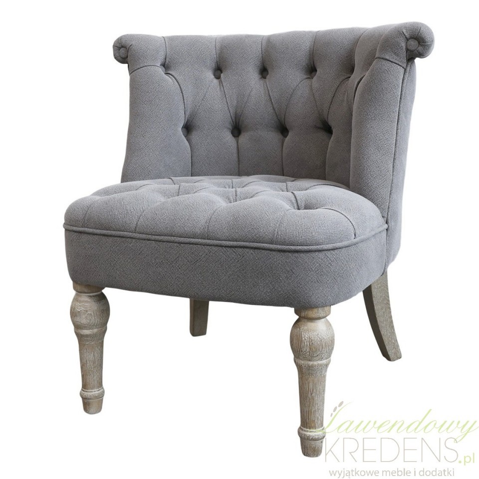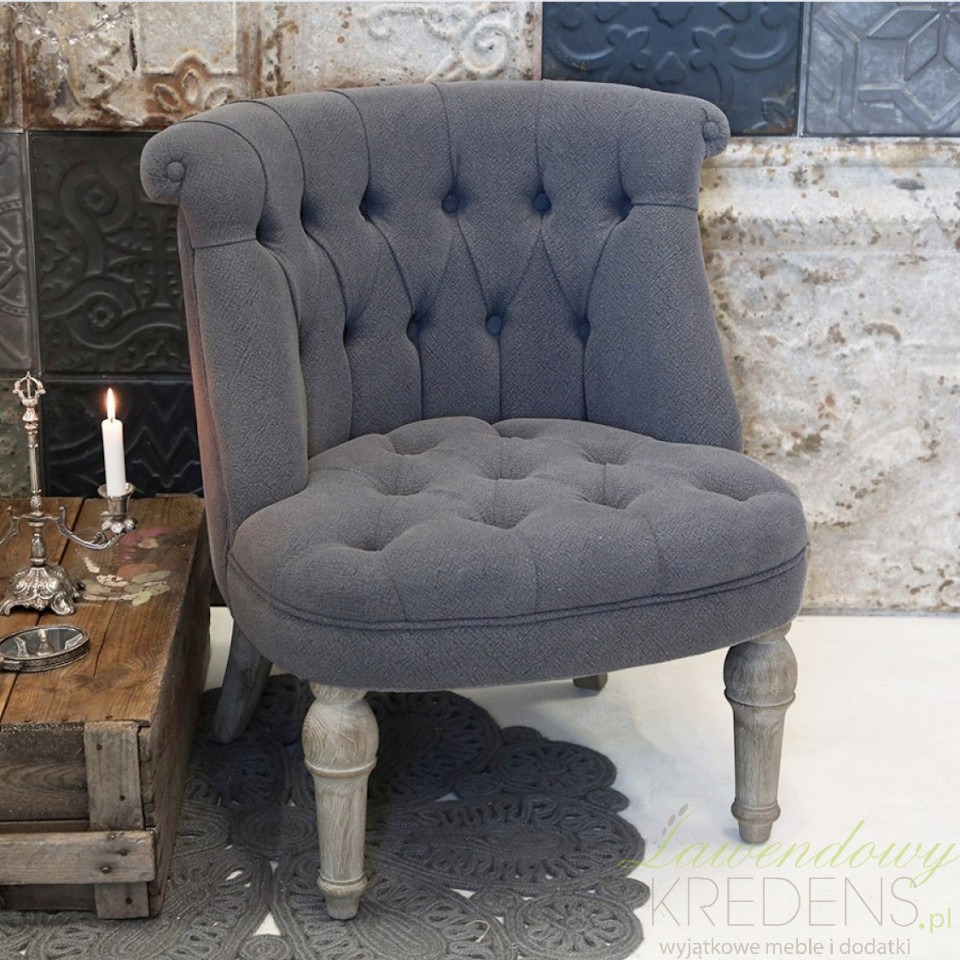 Szary fotel prowansalski z pikowanym siedziskiem i oparciem zasługuje na miano eleganckiego mebla.