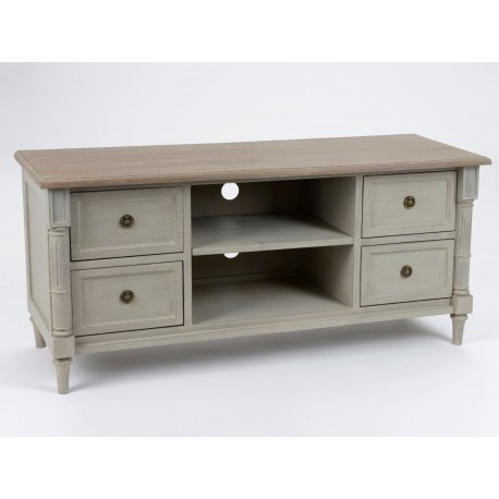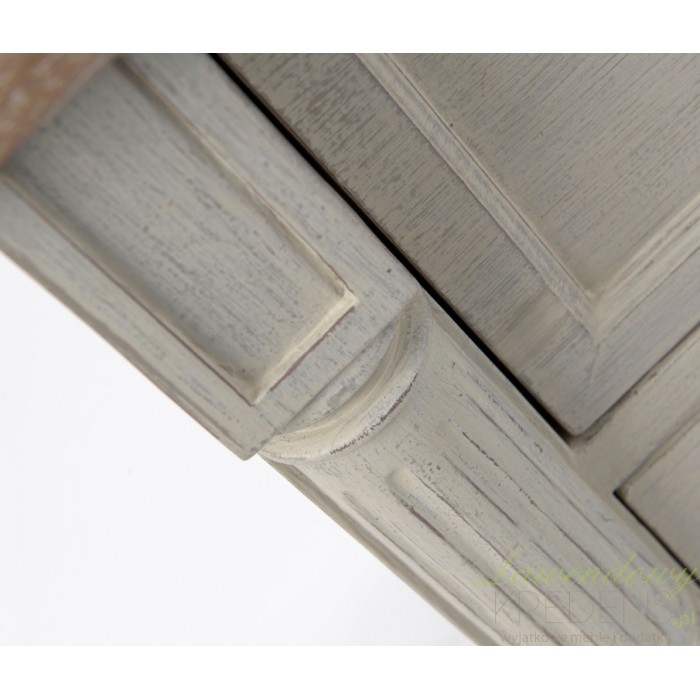 Szara komoda pod telewizor to mebel, który zarówno świetnie wygląda jak i jest bardzo praktyczny. Komoda zainspirowana sielskim stylem prowansalskim ma korpus oraz szuflady w kolorze szarym i jasnobrązowy blat. W jej wnętrzu znajduje się jedna półka pośrodku mebla i cztery pojemne szufladki. Meble w stylu prowansalskim z kolekcji Grissi, dzięki szarej kolorystyce pasują do każdego typu aranżacji.