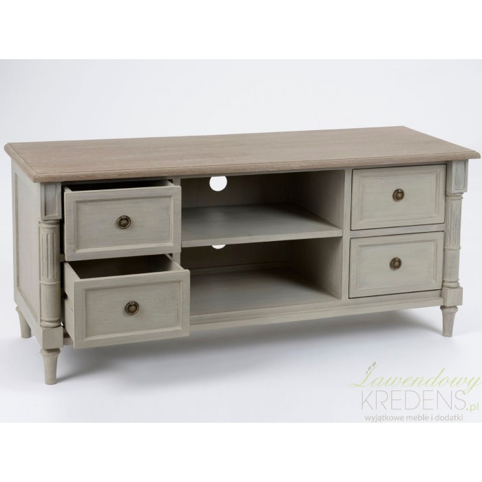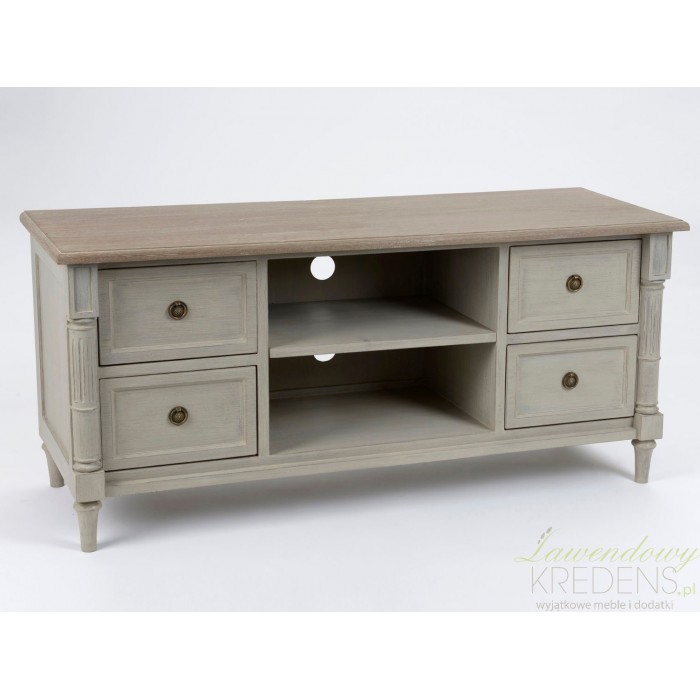 Szara komoda RTV wykonana w stylu prowansalskim to niezastąpiony mebel w salonie każdego kinomaniaka i jego rodziny.