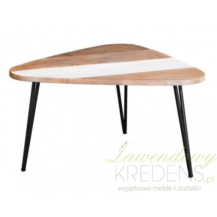 Stolik kawowy Livin Hill ma drewniany blat prezentujący interesujące połączenie różnokolorowych desek.