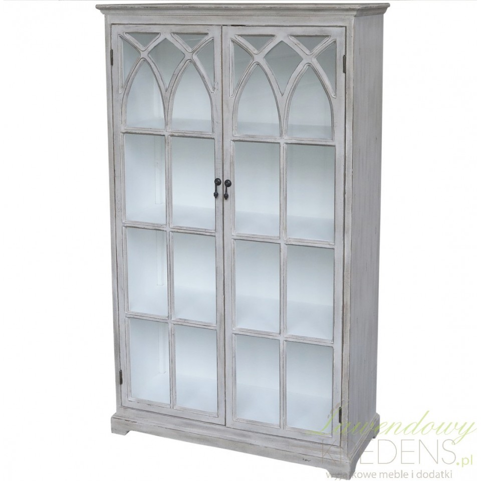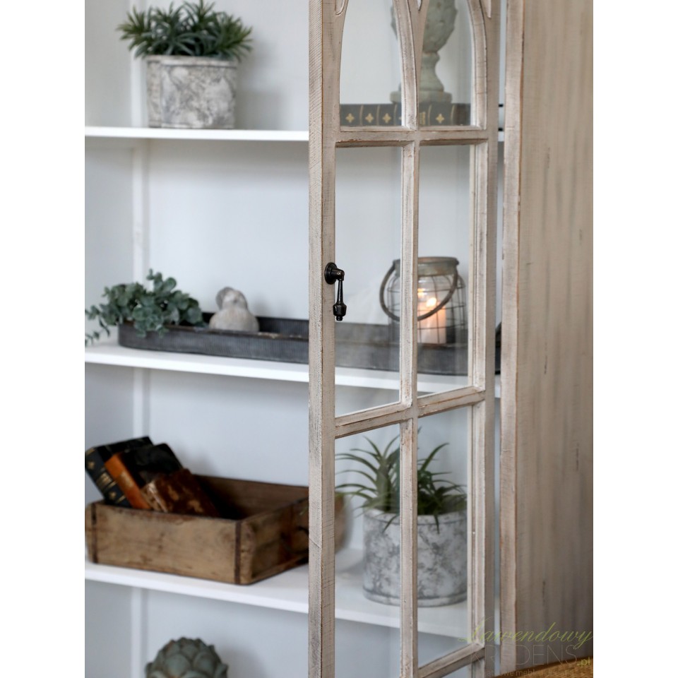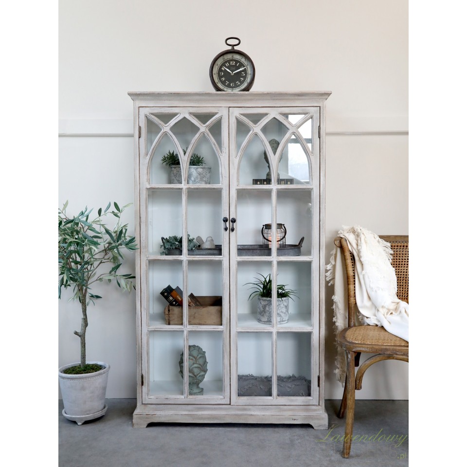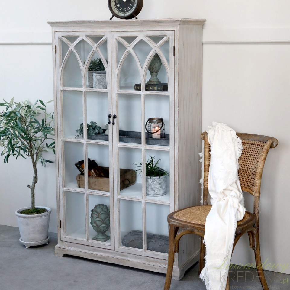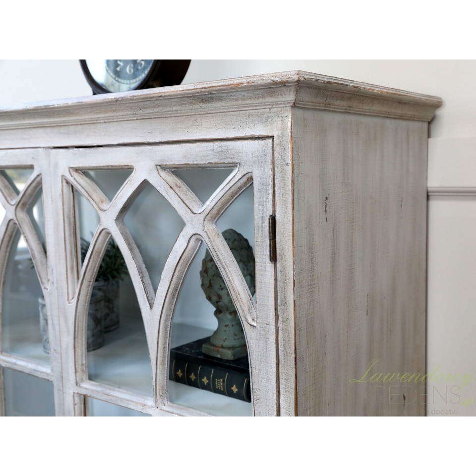 Charakterystyczne postarzenie powierzchni oraz ozdobne szprosy na drzwiach, układające się w delikatne łuki, nadają witrynie romantyczny i jednocześnie wyrafinowany wygląd. To idealny mebel dla miłośników subtelnych, a zarazem wyrazistych akcentów.