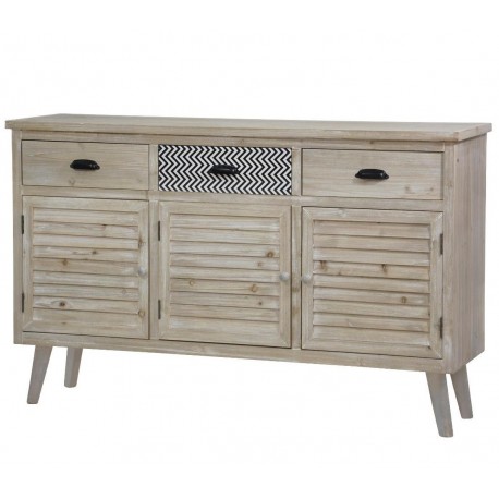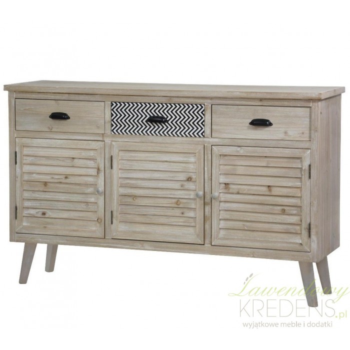 Szeroka komoda Loano ma naturalny kolor jasnego drewna. Została wyposażona w trzy pojemne szufladki z metalowymi uchwytami oraz trzy szafki. Każda z szafek ma oddzielne drzwi, które wykonane są z deseczek ułożonych w formie żaluzji. Meble Livin Hill są dla tych, którzy przepadają za naturalnością.