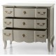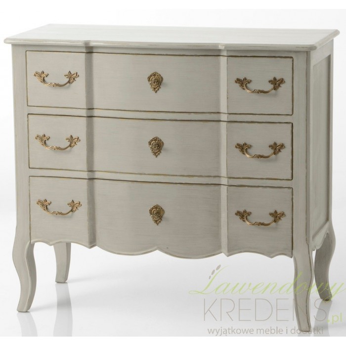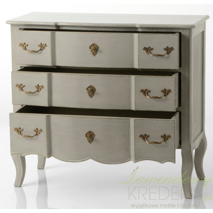 Nadająca wnętrzu prowansalski szyk szara komoda z serii Baletti, wyposażona w trzy szerokie, udekorowane złotymi gałkami szuflady. Ta elegancka komoda to świetny pomysł na urządzenie dużych przestrzeni, takich jak salony, gabinety i sypialnie. Szare meble doskonale łączą się z aranżacjami w różnych kolorach, dlatego bez obaw możesz włączyć ją do swojego wnętrza. Postaw na szyk i klasę i zamów zestaw ulubionych mebli francuskich już teraz!