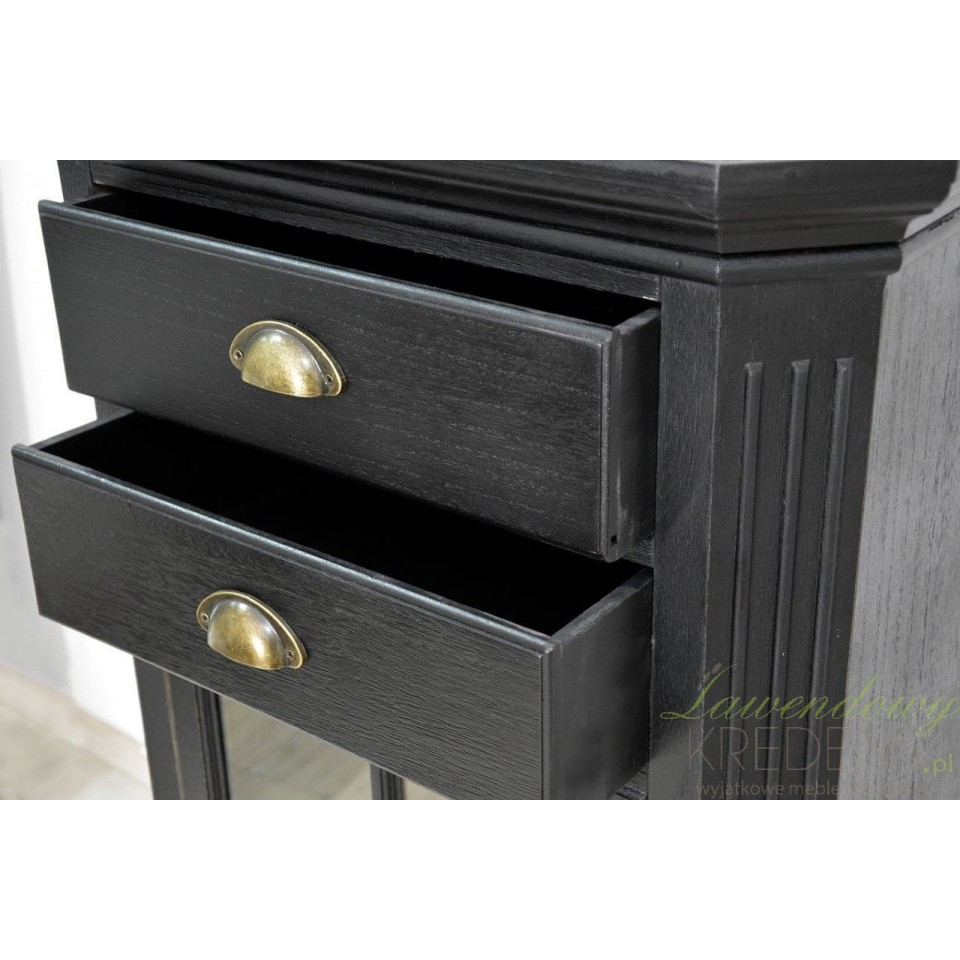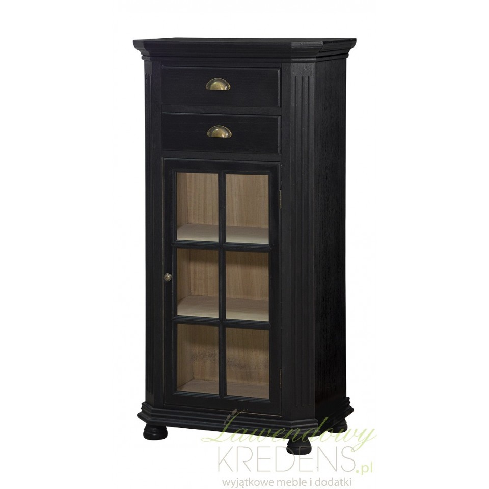 Wykonana z wysokiej jakości drewna topoli i innych, solidnych materiałów - ta czarna witryna Cesena w stylu prowansalskim Livin Hill ma szklane drzwi i dwie szufladki.