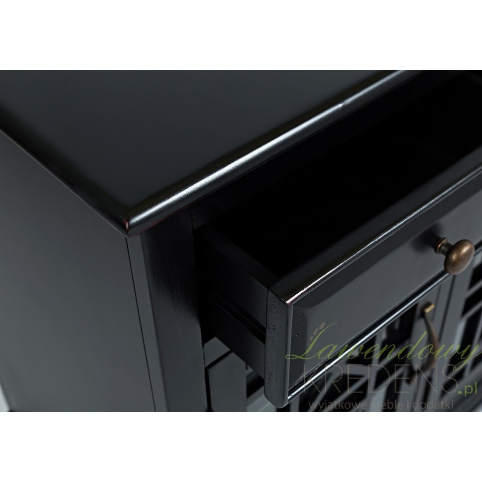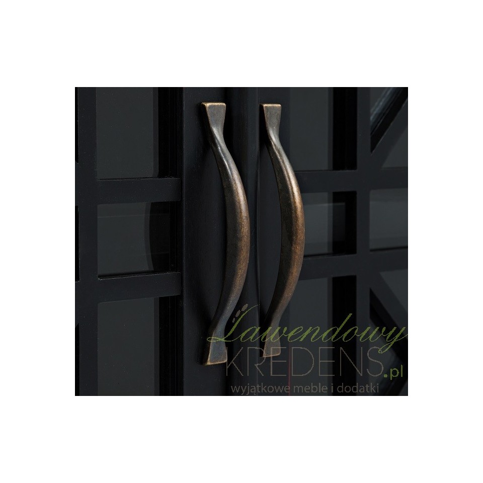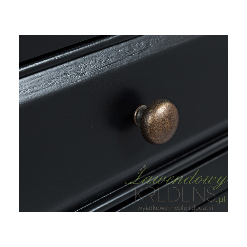 Meble Avola - jedne z długowiecznych mebli drewnianych, dostępne w atrajcyjnych wersjach kolorystycznych. Czarna komoda Avola Antique Black jak wskazuje jej nazwa jest postarzana, co najbardziej widać w miejscach frezowania szuflad. Komoda wyposażona jest w przeszklone drzwi z szprosami dzielącymi je na małe okienka. Meble Livin Hill o naturalnym, antycznym wyglądzie pasują do wnętrz francuskich, prowansalskich i retro.