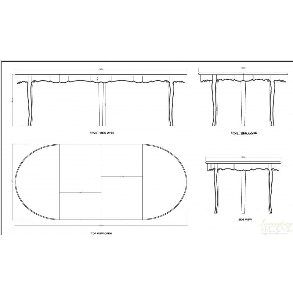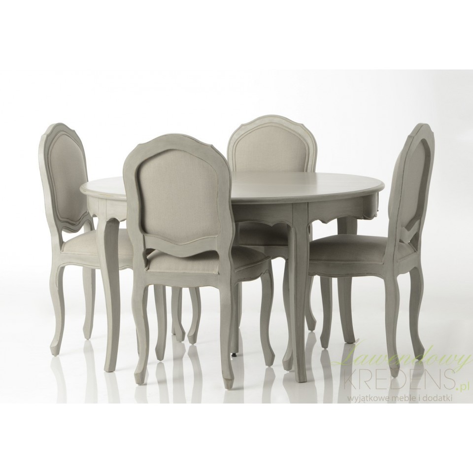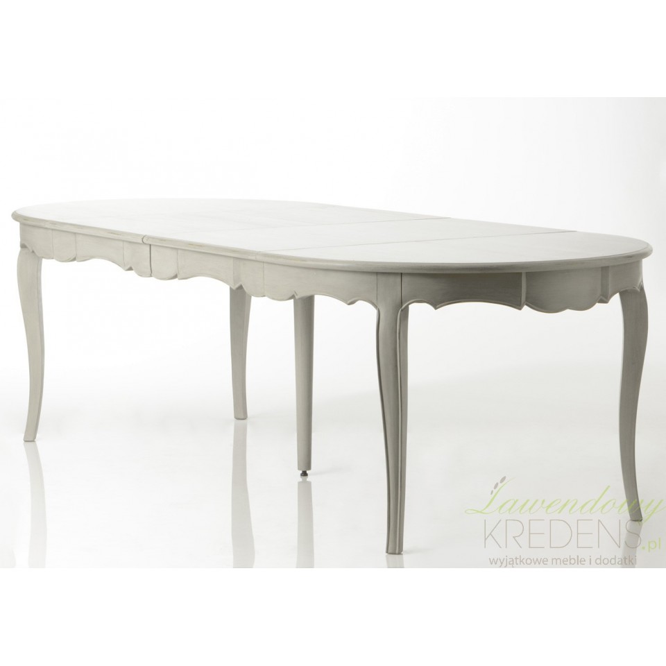 Efektowny, oryginalny stół prowansalski z owalnym blatem. Surowy, szary kolor sprawia, że to mebel idealnie pasujący do wielu stylów aranżacyjnych. Masywny blat osadzony został na podstawie wykonanej z pięciu, rzeźbionych i subtelnie wygiętych nóg.