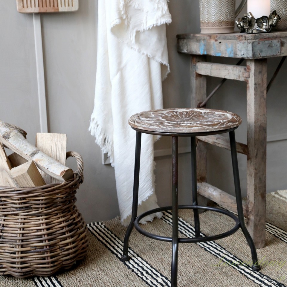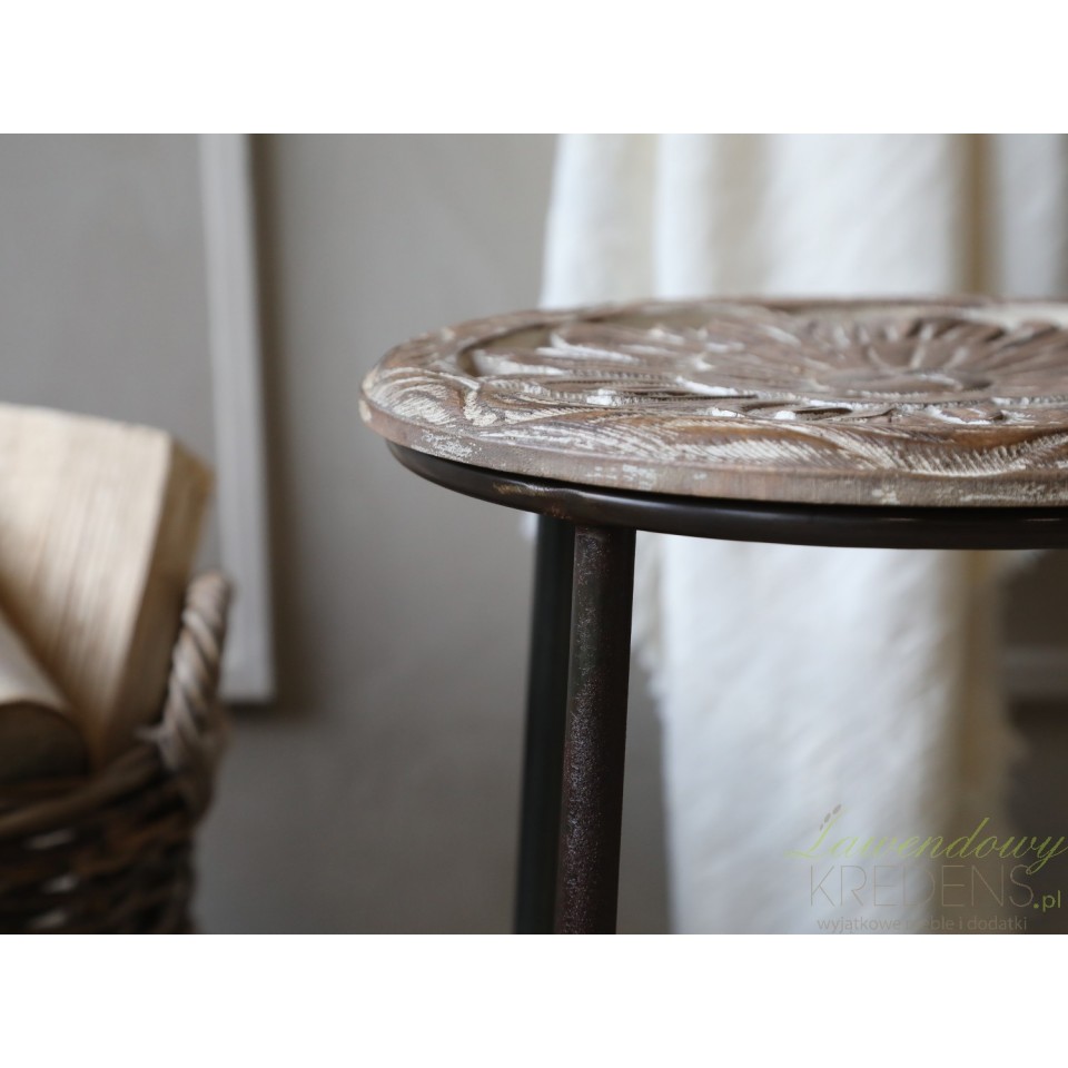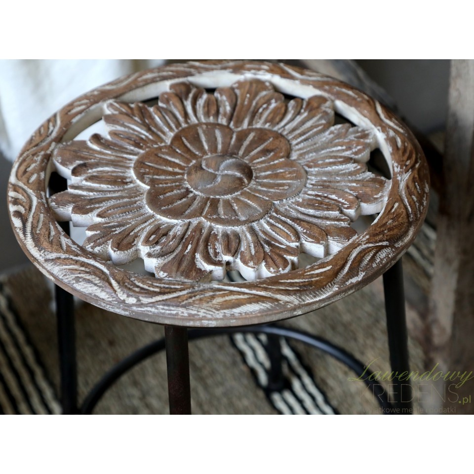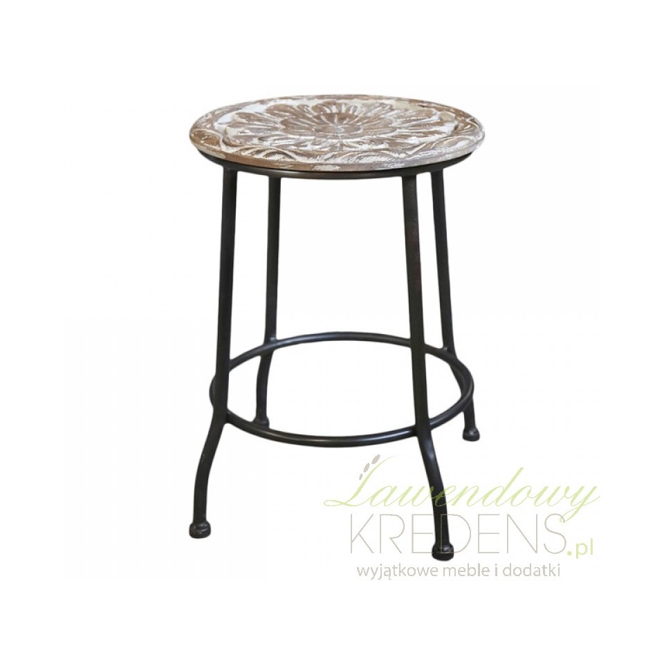 Wytrzymały stołek z drewnianym siedziskiem to ciekawy dodatek do Twojego domu. Stołek Chic Antique wykonany jest z bielonego drewna i z wysokiej jakości metalu w czarnym kolorze. Na powierzchni okrągłego siedziska można dostrzec rzeźbienia wraz z niedoskonałościami, które podkreślają autentyczność mebla w stylu retro. Wszelkie niedopracowania stylizują metalowe stołki na meble z bogatą historią.