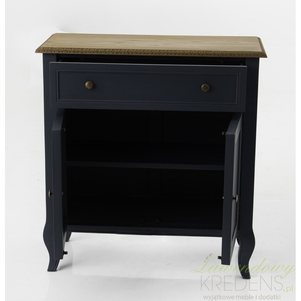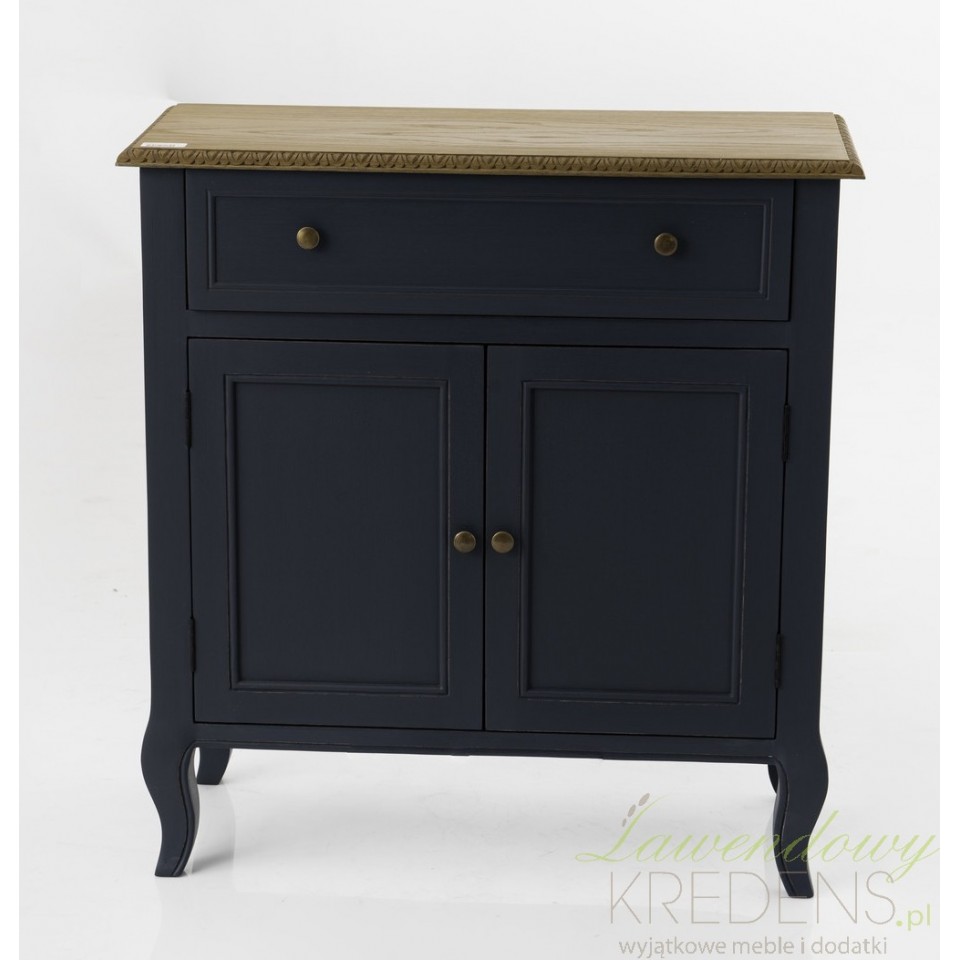 Zwolnij miejsce w szafie dzięki tej komodzie do przechowywania z kolekcji Salini, która zawiera pojemną szufladę i przestronną szafkę. Komoda w stylu prowansalskim w eleganckim, granatowym wykończeniu, z okrągłymi metalowymi uchwytami będzie idealnym uzupełnieniem Twojego eleganckiego salonu lub klasycznej sypialni. Grantowa komoda posiada brązowy blat, który jest doskonałym miejscem do tego, aby wyeksponować swoje zdjęcia lub akcenty dekoracyjne.