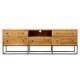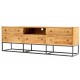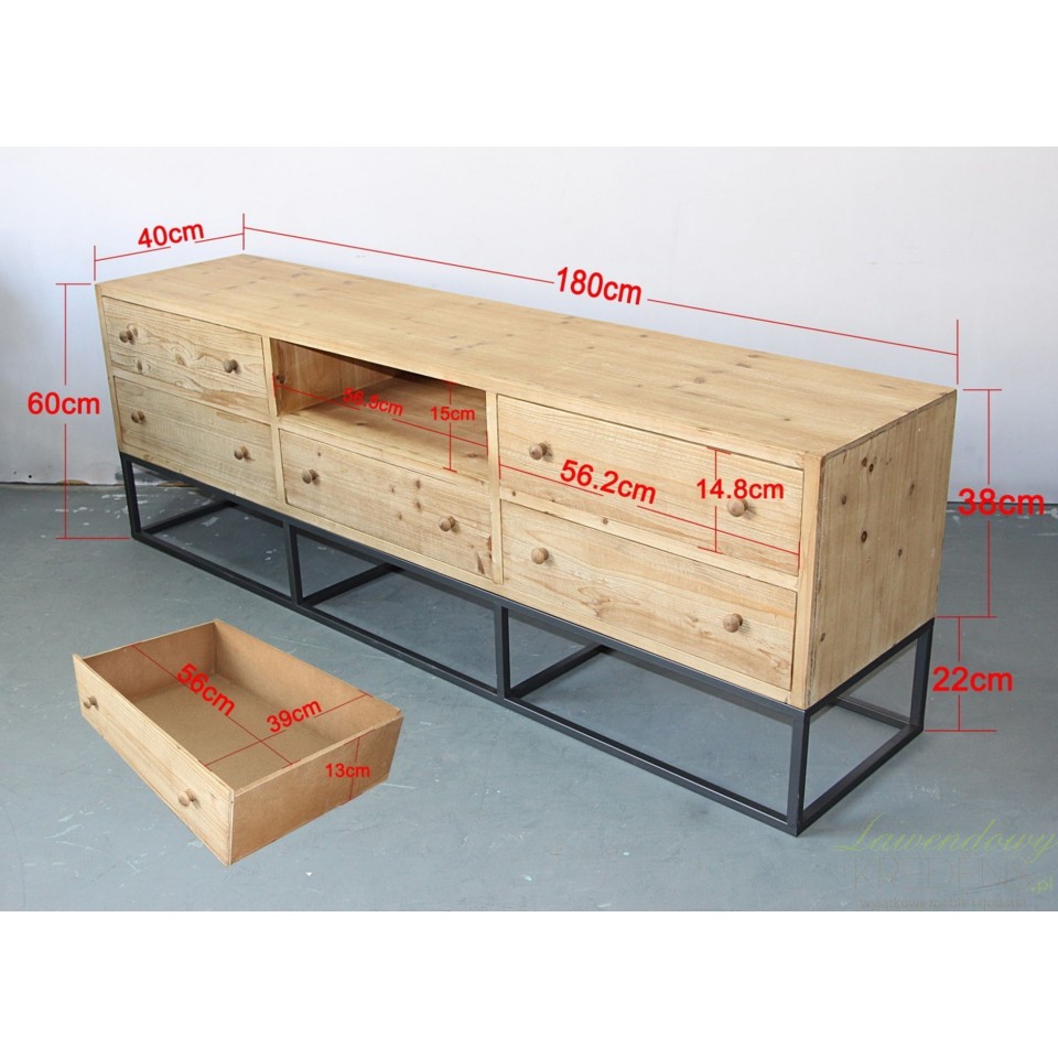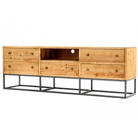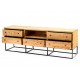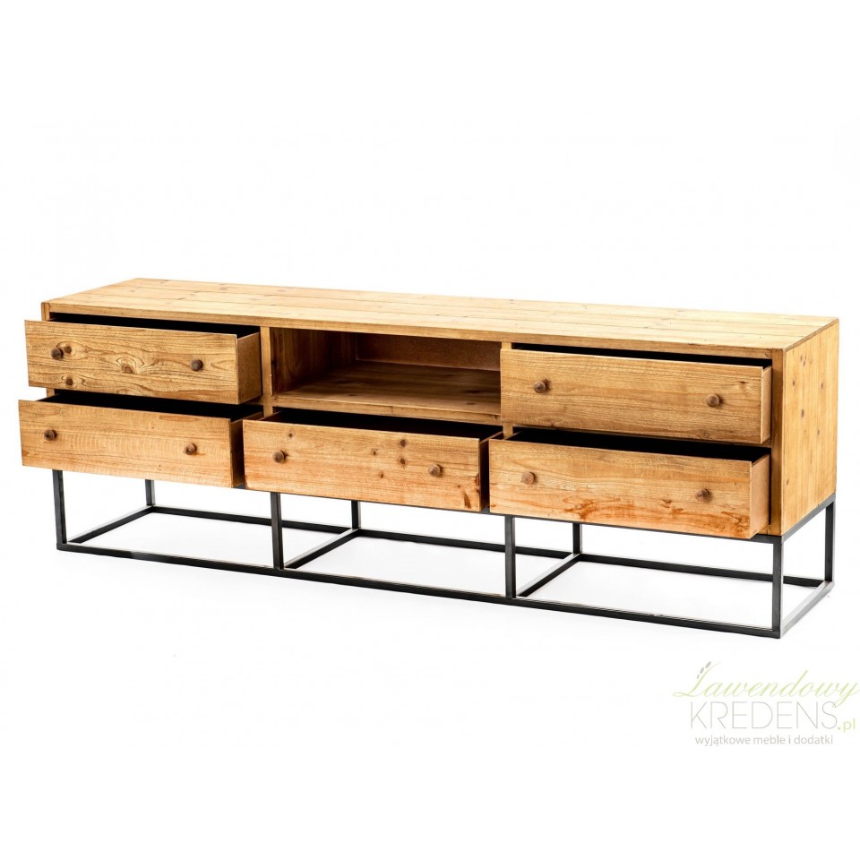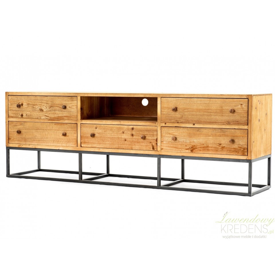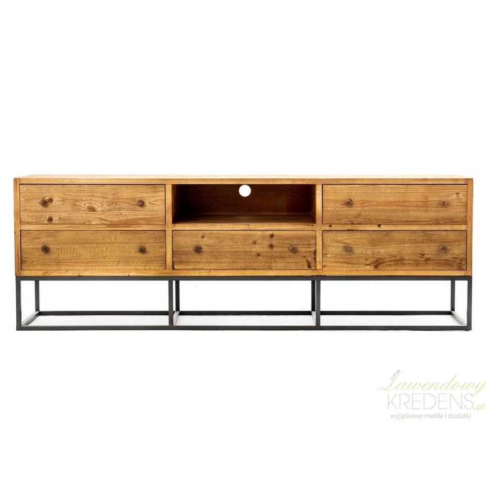 Meble w stylu loftowym w interpretacji francuskiego producenta to solidne wykonanie i atrakcyjny design. Drewniana komoda loft pod telewizor posiada kilka pojemnych szuflad z okrągłymi gałkami i półkę, na której zmieści się Xbox lub Playstation. Naturalny, jasny kolor mebla i bogate usłojenie to jedne z jego licznych atutów. Komoda pod telewizor z szlachetnego drewna i metalu zostanie z Tobą na długie lata!