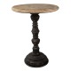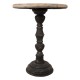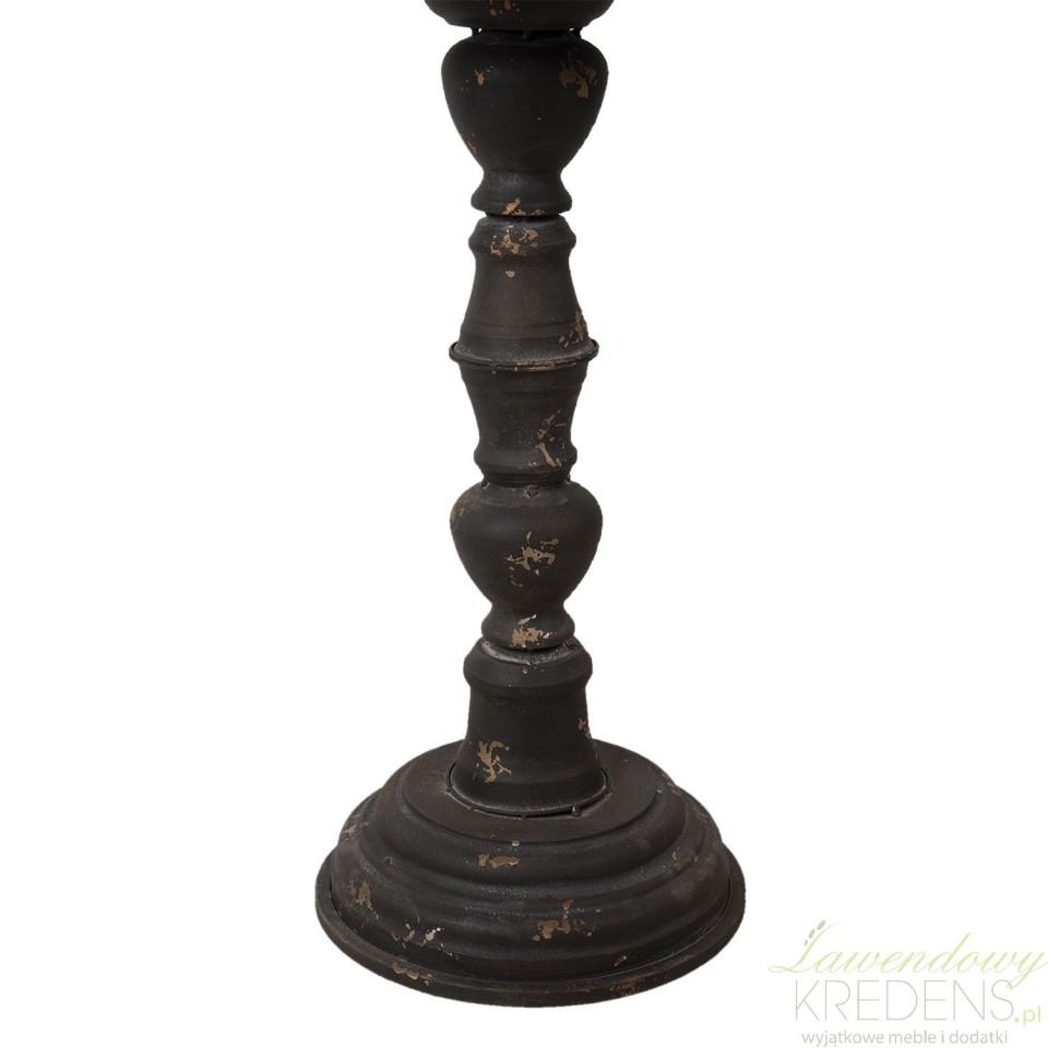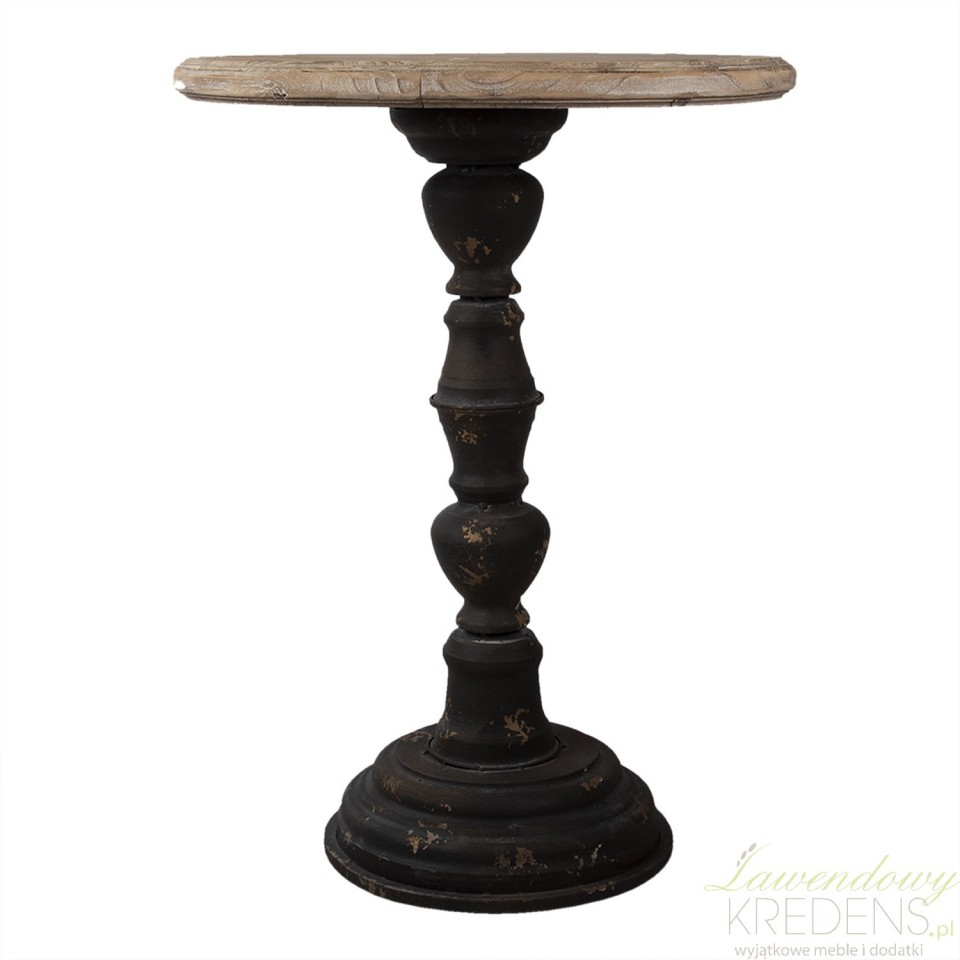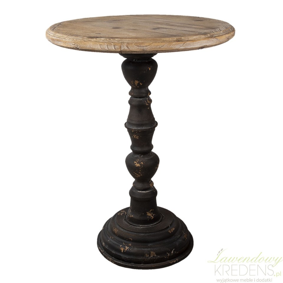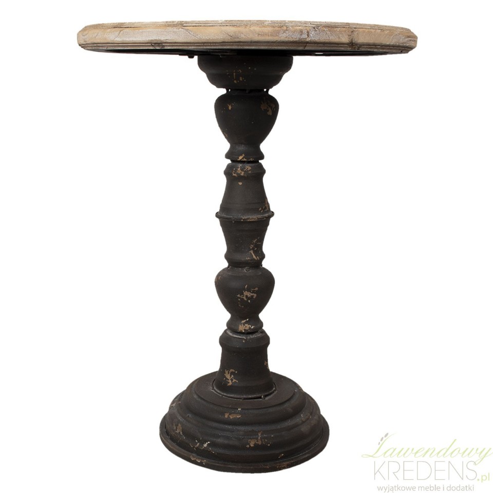 Okrągły stolik w stylu prowansalskim to mebel noszący widoczne ślady postarzeń, które można zauważyć w szczególności na czarnej nodze.
