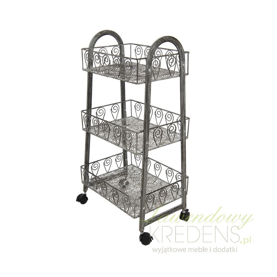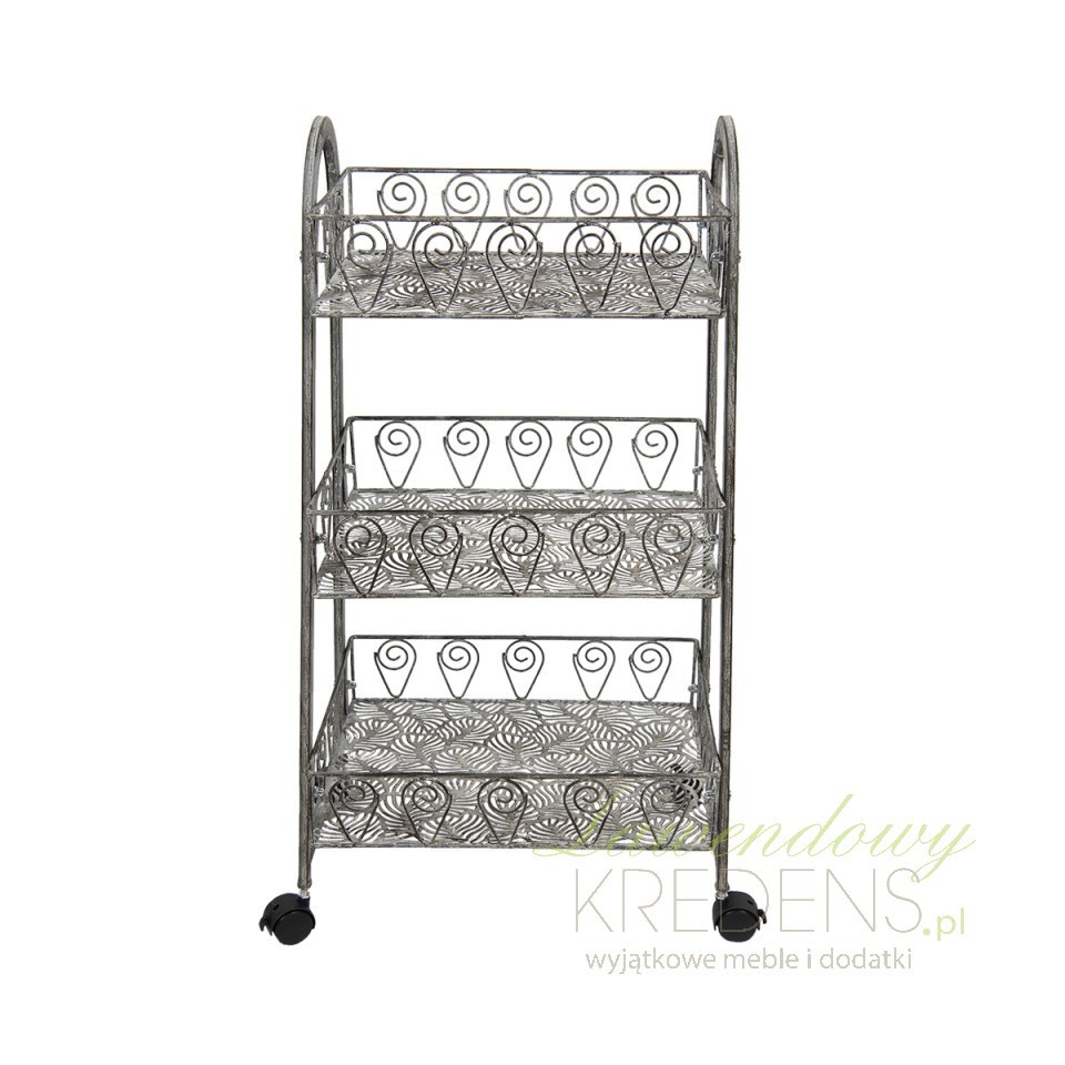 Metalowa szafka prowansalska na kółkach Clayre & Eef ma trzy półki w formie ażurowych koszyków, idealne do przechowywania wszystkiego co chcesz mieć zawsze w zasięgu ręki!
