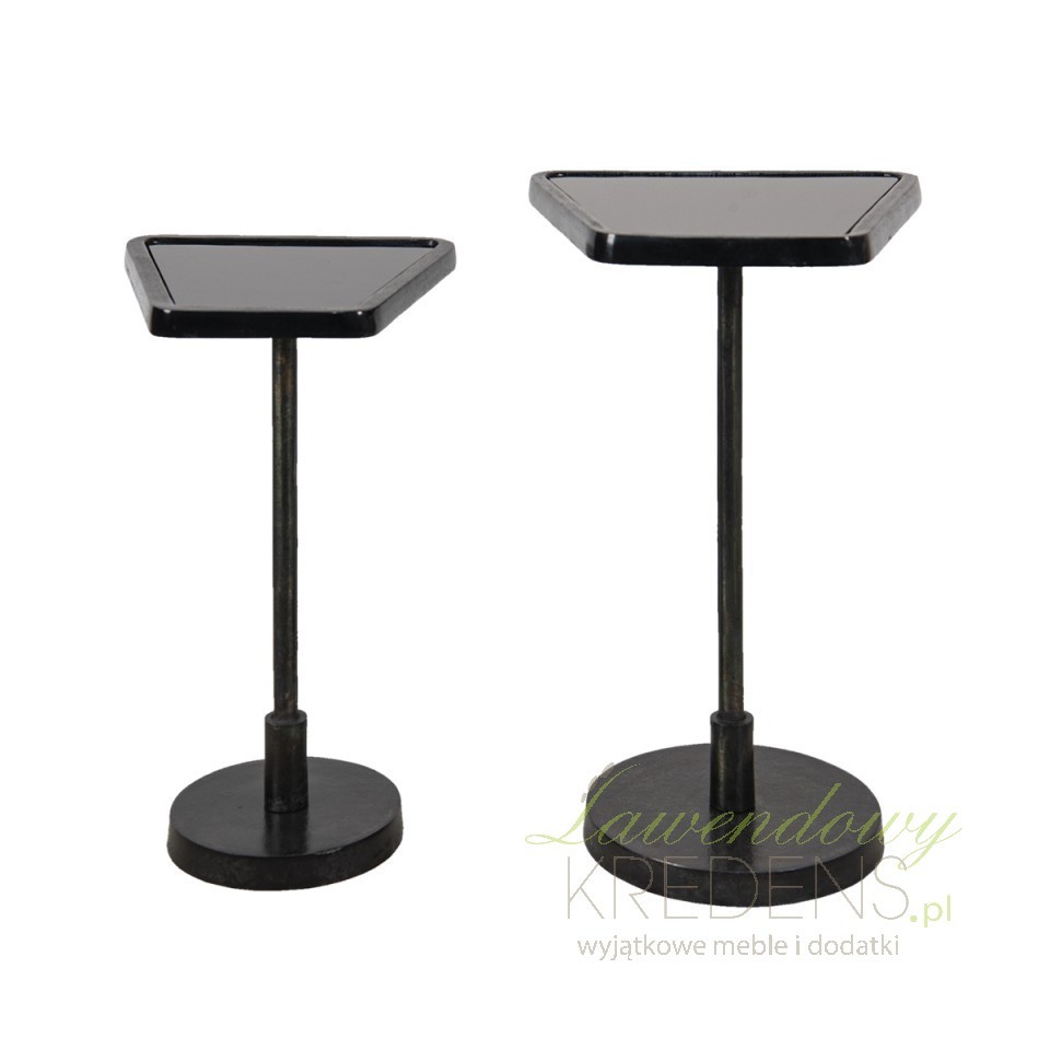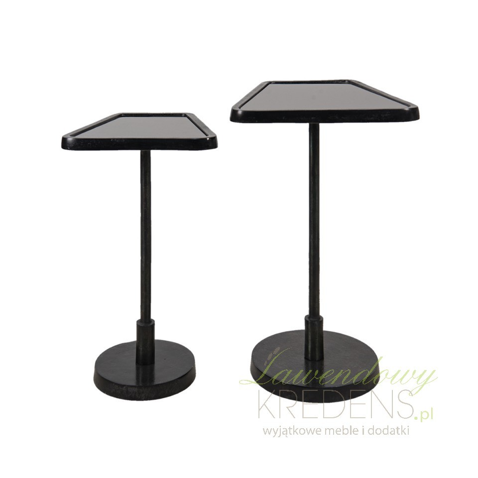 Dwa metalowe stoliki ze szklanymi blatami Clayre & Eef ustawione są na jednej nodze i niezwykle stabilne dzięki okrągłej podstawie.