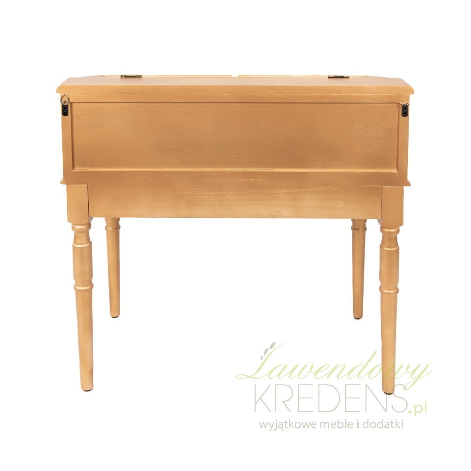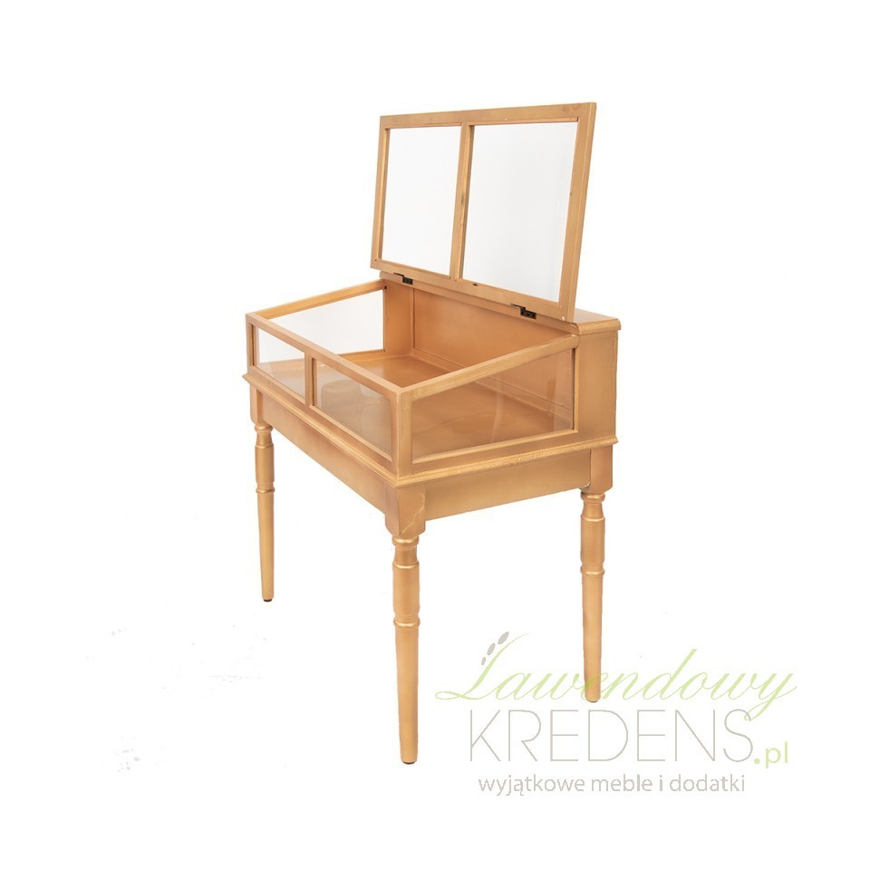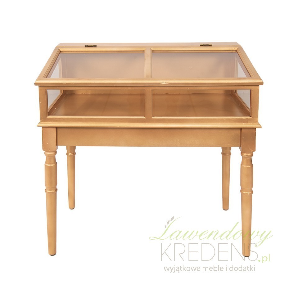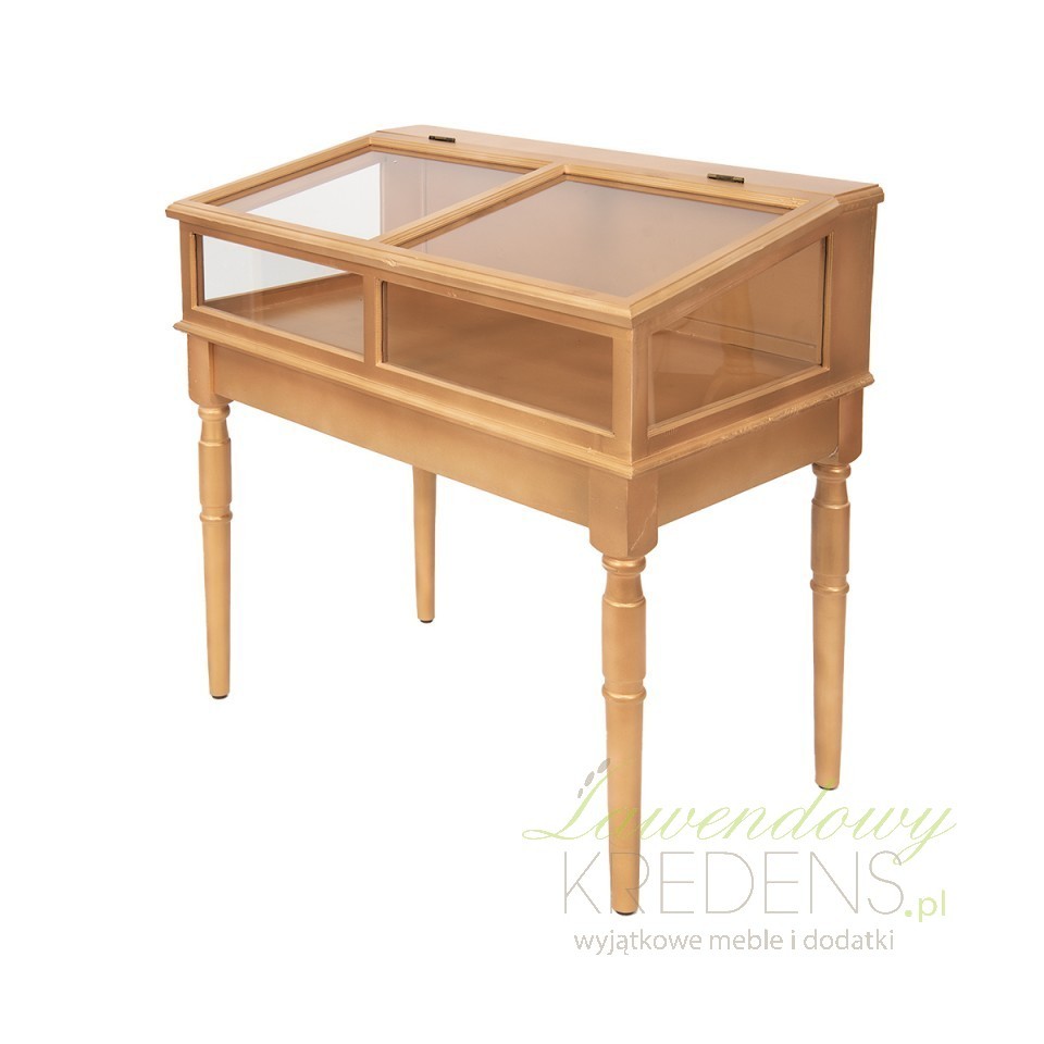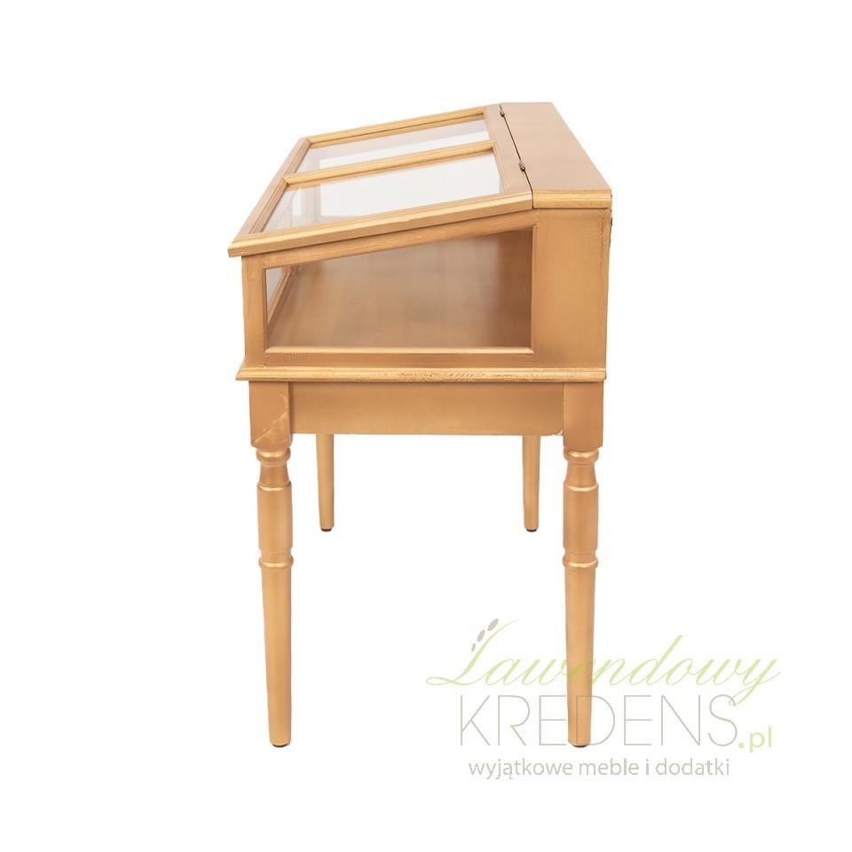 Drewniana konsola ze szklaną gablotą w złotym kolorze to element wyposażenia wnętrza o prostych i eleganckich liniach, który został stworzony z myślą o eksponowaniu rozmaitych przedmiotów. Z pewnością nie raz już spotkałeś tego typu mebel w sklepie u jubilera lub w galerii sztuki. Nic nie stoi na przeszkodzę abyś teraz wykorzystał go w swoim domu! Konsola z przeszkloną gablotą świetnie nadaje się do przechowywania drogocennych drobiazgów, które chcesz mieć w zasięgu wzroku. Zamów już dzisiaj!