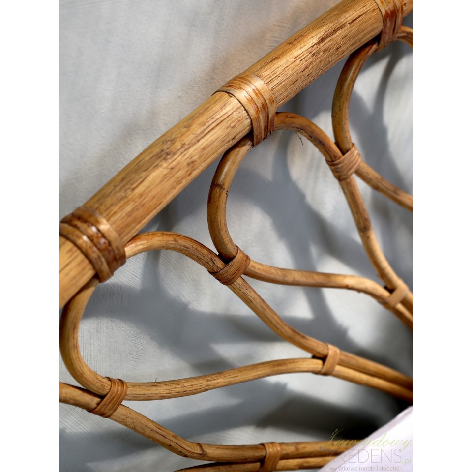 Jasnobrązowy odcień rattanu, w jego naturalnej, delikatnie połyskującej formie, idealnie harmonizuje z neutralnymi wnętrzami, a zaokrąglony kształt pleciony na wzór promieni słońca dodaje całej kompozycji subtelności i uroku.