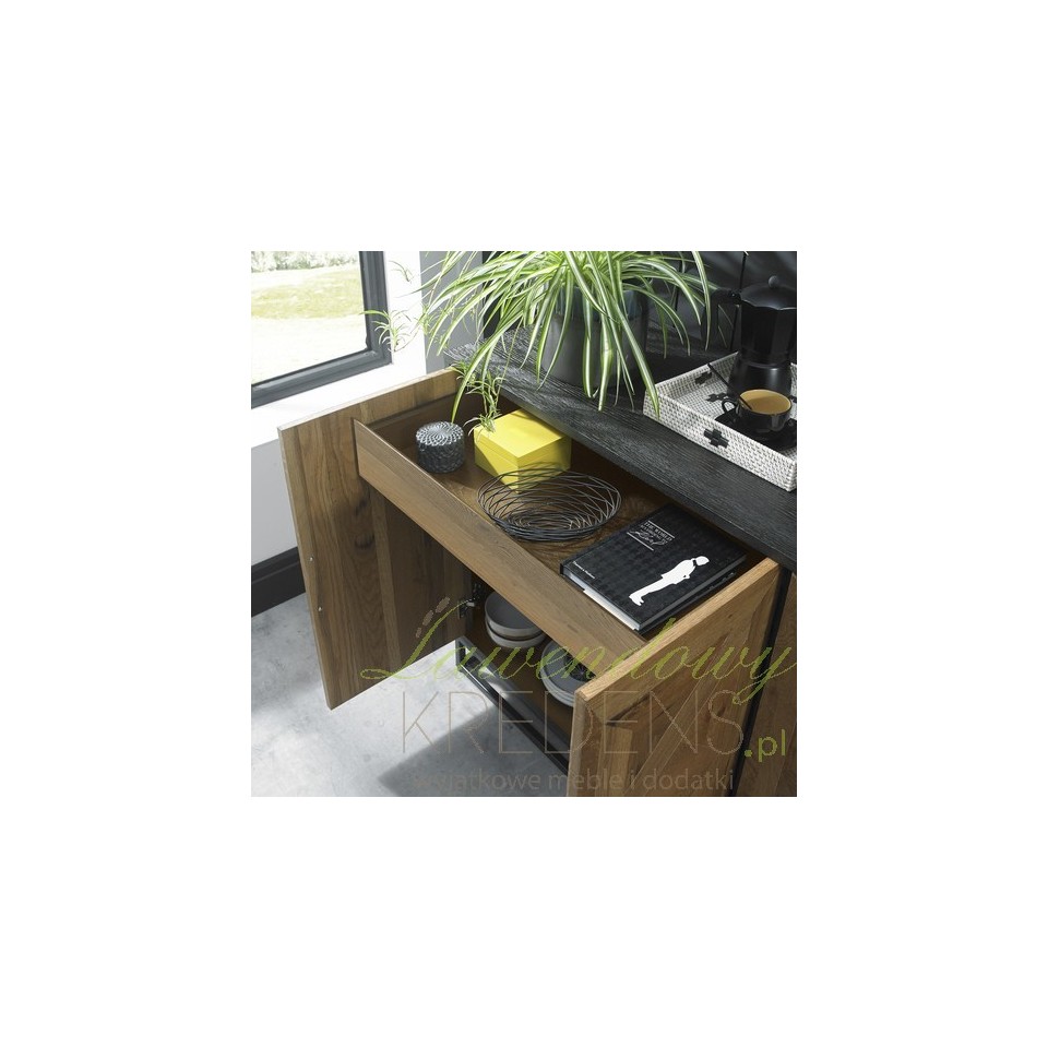 Oto praktyczna komoda Livin Hill Indus – wykonana z wytrzymałej konstrukcji metalowej w kolorze czarnym, zestawiona z drewnianymi elementami.