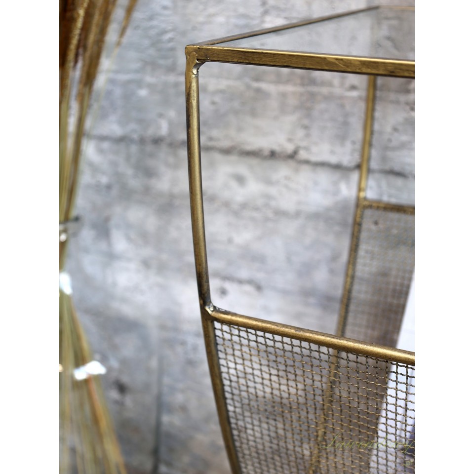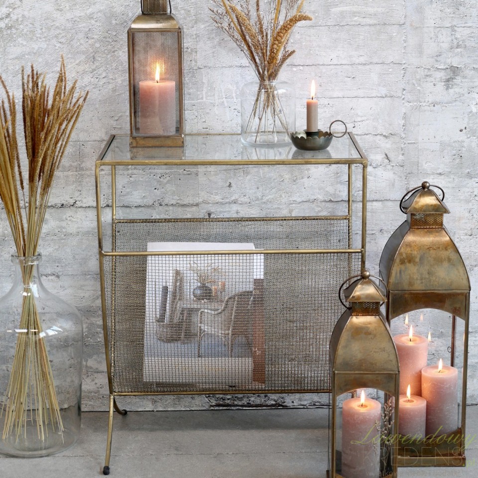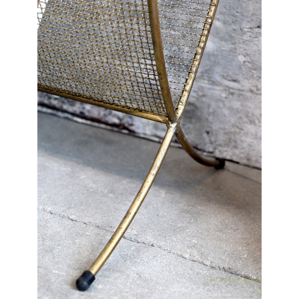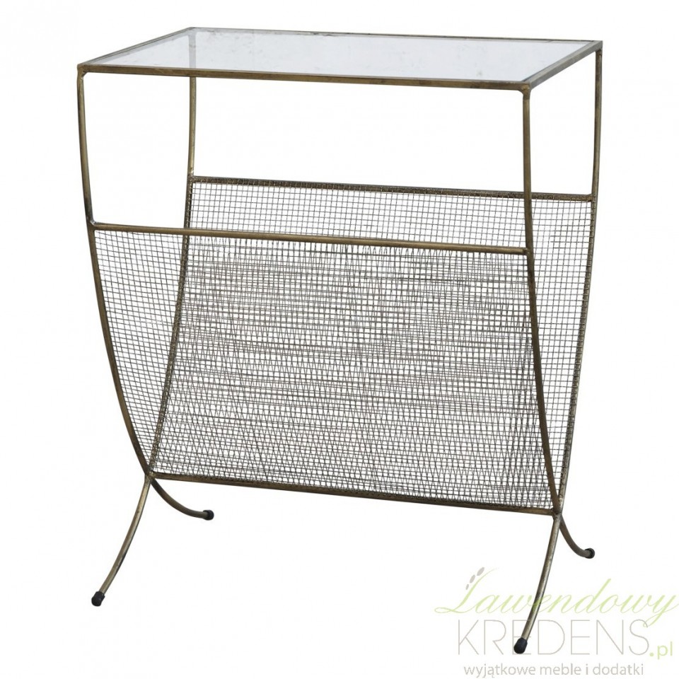 Otwórz swoje wnętrze na nowe meble skandynawskie! Oto metalowy stolik z gazetnikiem Chic Antique w kolorze antycznego mosiądzu, ze szklanym blatem i perforowanym pojemnikiem.