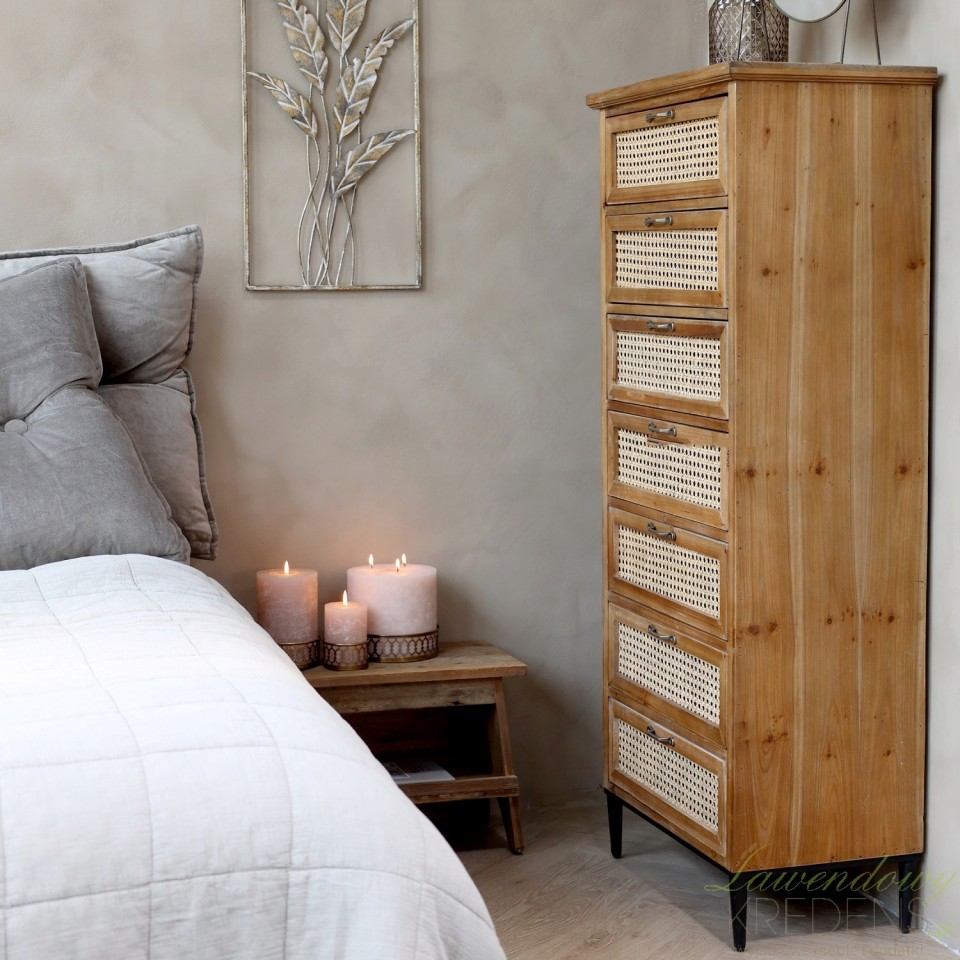 Zdecyduj się na komodę Chic Antique, praktyczny mebel, idealny do urozmaicenia wystroju wnętrza i wzbogacenia układu salonu lub sypialni. Komoda boho Chic Antique z rattanowymi frontami znajdzie swoje miejsce w przestronnym pokoju jak i w pracowni. Wyposażona jest w siedem podłużnych szuflad, dedykowanych do przechowywania odzieży, bielizny lub innych rzeczy osobistych, jak również dokumentów i artykułów piśmienniczych. Ta komoda ma solidną i trwałą konstrukcję z elementami metalowymi i drewnianymi. Tak jak wszystkie meble w stylu boho od duńskiej marki została zaprojektowana z myślą o długotrwałym użytkowaniu.